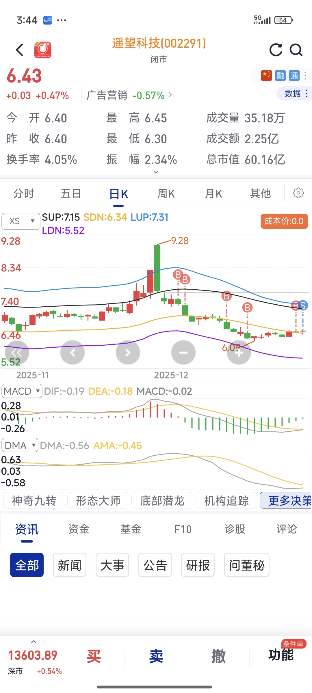 说实话,这次栽了,遥望我看日线是有一个反弹的,但是一直未至,这个月其他票的盈利基本给遥望亏完了,昨天打满了仓位想搏一搏今天一个反弹走,我怕啊,基本面太差了,我怕暴雷,今年做的最后一只票了,今年做的太差了,连指数都没跑过,准备空仓到春节休息沉淀一下了