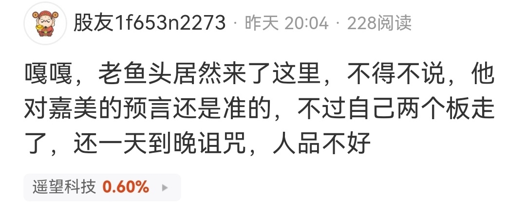 $遥望科技(SZ002291)$ 嘉美包装贴吧里的小号托,跑着来发帖子指责我的人品不好。