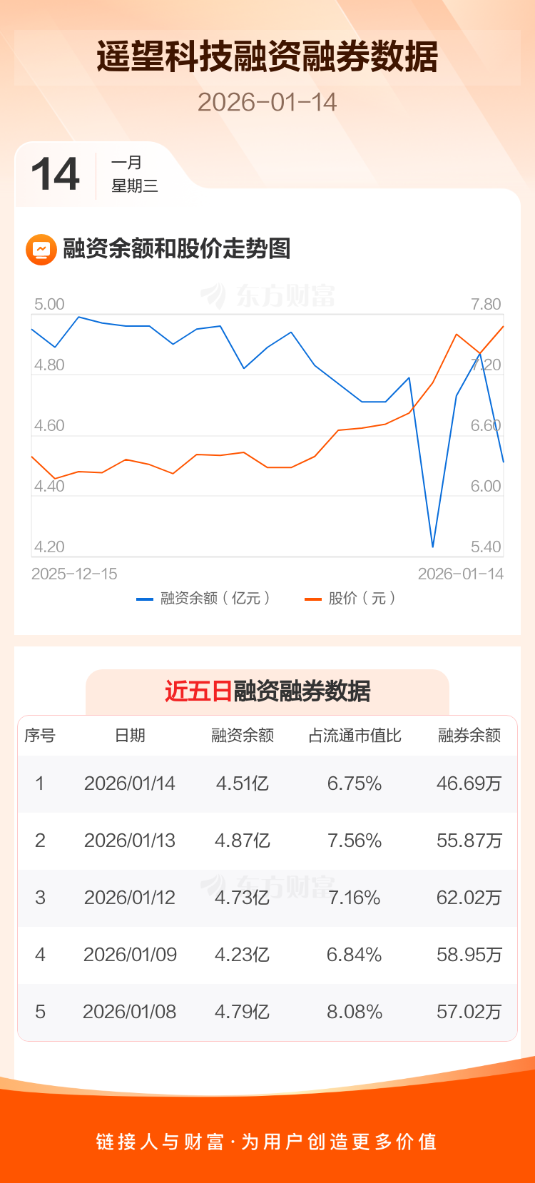 交易所最新数据显示,遥望科技于2026年1月14日获融资买入9343.81万元,融资偿还1.30亿元,当日融资净偿还3626.79万元。目前,该股融资余额4.51亿,占流通市值比例为6.75%。