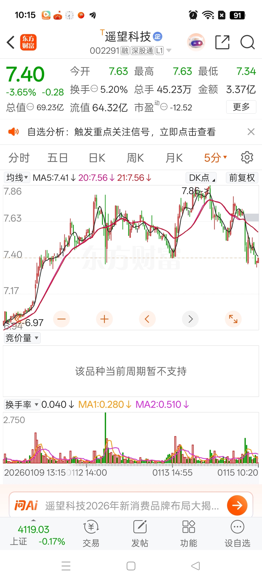 $遥望科技(SZ002291)$ 今天底部大概率应该是在7块3毛四附近