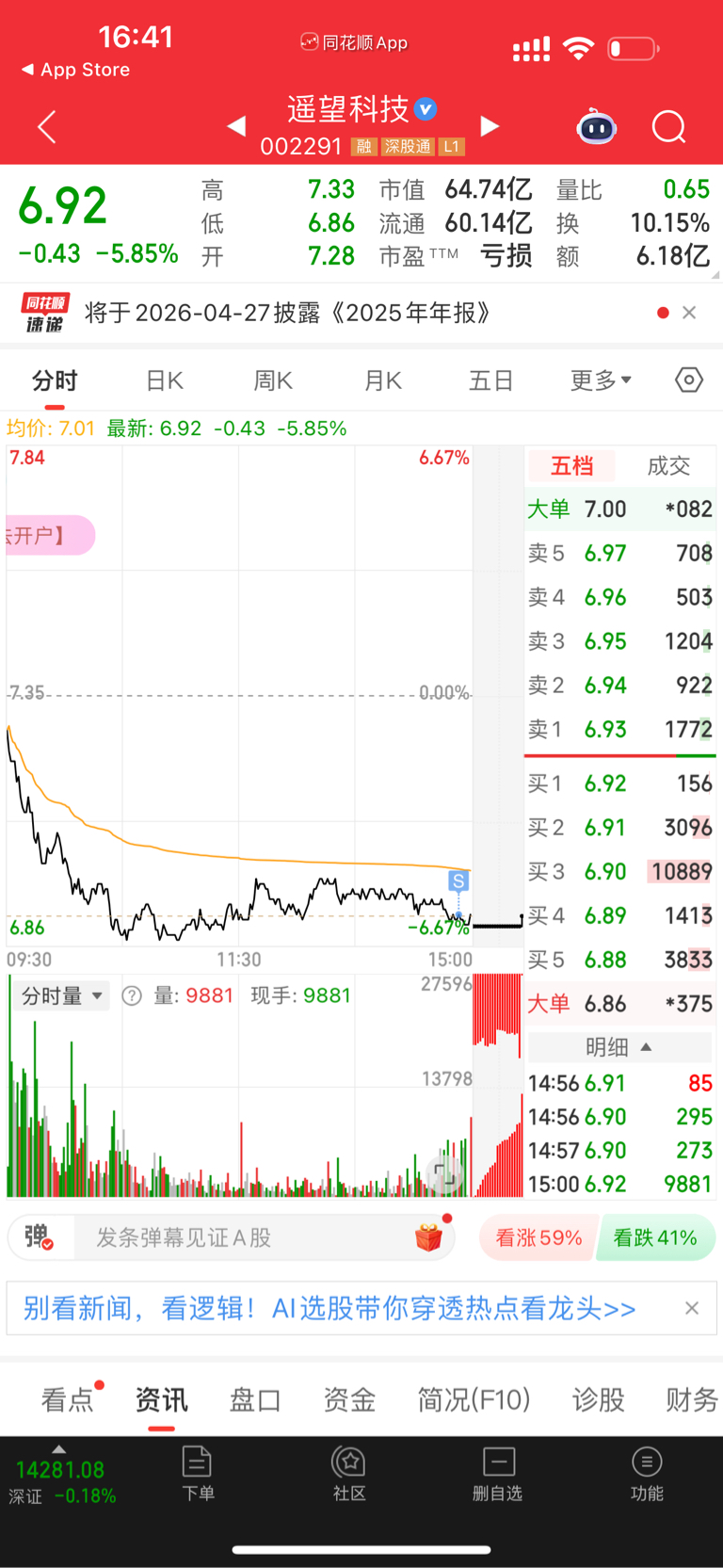 $遥望科技(SZ002291)$ 一天犹豫不决 最后卖掉.轻松了 等大盘调整好好 买别的了 .遥望再见.里面的人希望你们赚钱....