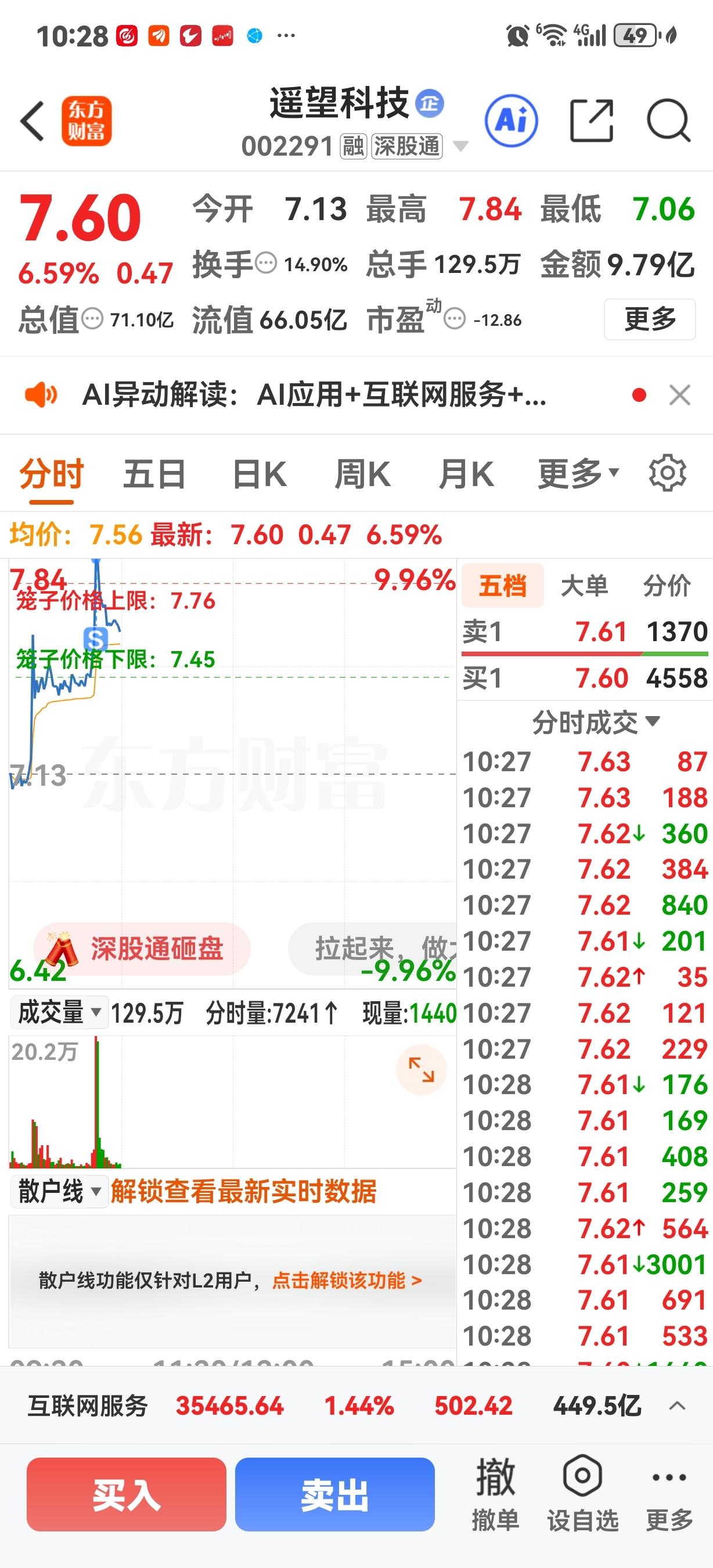 $遥望科技(SZ002291)$ 小情人,我爱你,就你没有亏过我,昨天7.13入手,今天7.84出,Nice.