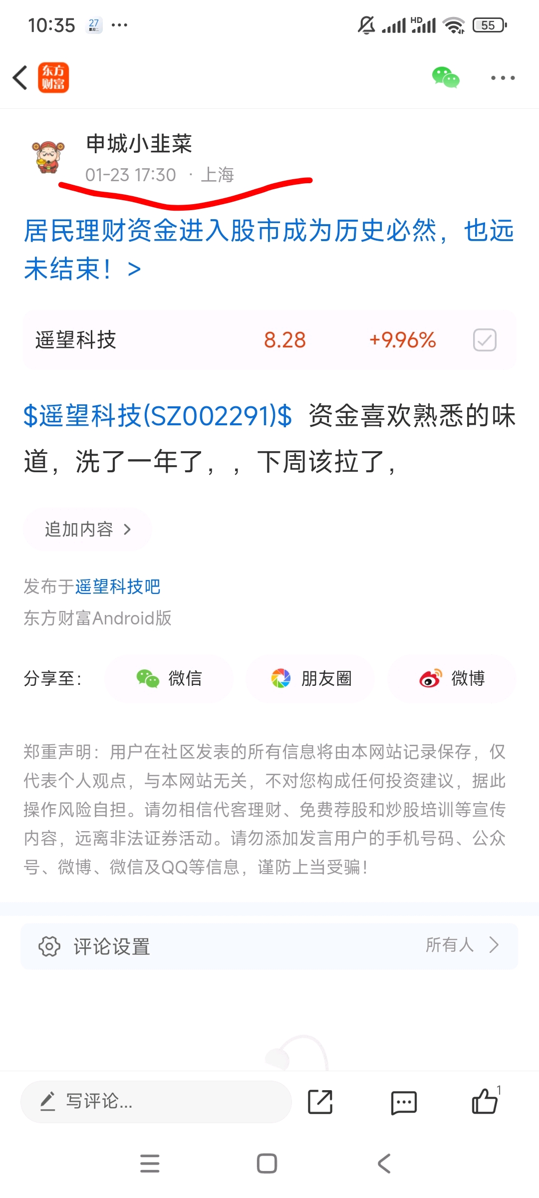 温馨提示: 1.根据《证券法》规定,禁止编造、传播虚假信息或者误导性信息,扰乱证券市场;2.用户在本社区发表的所有资料、言论等仅代表个人观点,与本网站立场无关,不对您构成任何投资建议。用户应基于自己的独立判断,自行决定证券投资并承担相应风险。《东方财富社区管理规定》