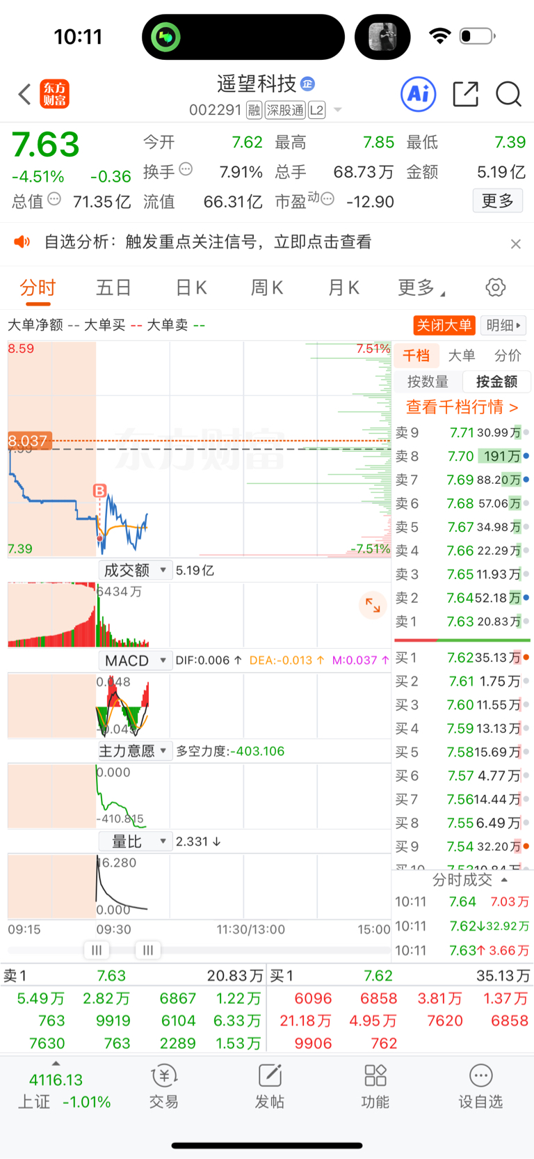 $遥望科技(SZ002291)$ 本来想再加一笔,想想算了,留着下星期加,今天没做T是太可惜了,跟你耗上了