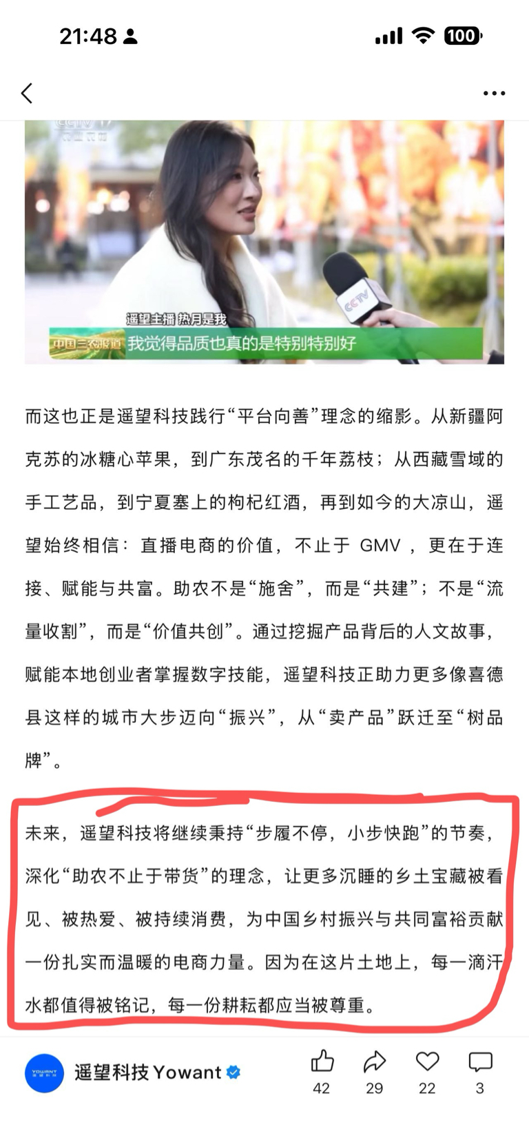 $遥望科技(SZ002291)$ 刚过去一个月,被CCTV点名表扬过,遥望科技将继续秉持“步履不停,小步快跑”的节奏,深化“助农不止于带货”的理念,让更多沉睡的乡土宝藏被看见、被热爱、被持续消费,为中国乡村振兴与共同富裕贡献一份扎实而温暖的电商力量。因为在这片土地上,每一滴汗水都值得被铭记,每一份耕耘都应当被尊重