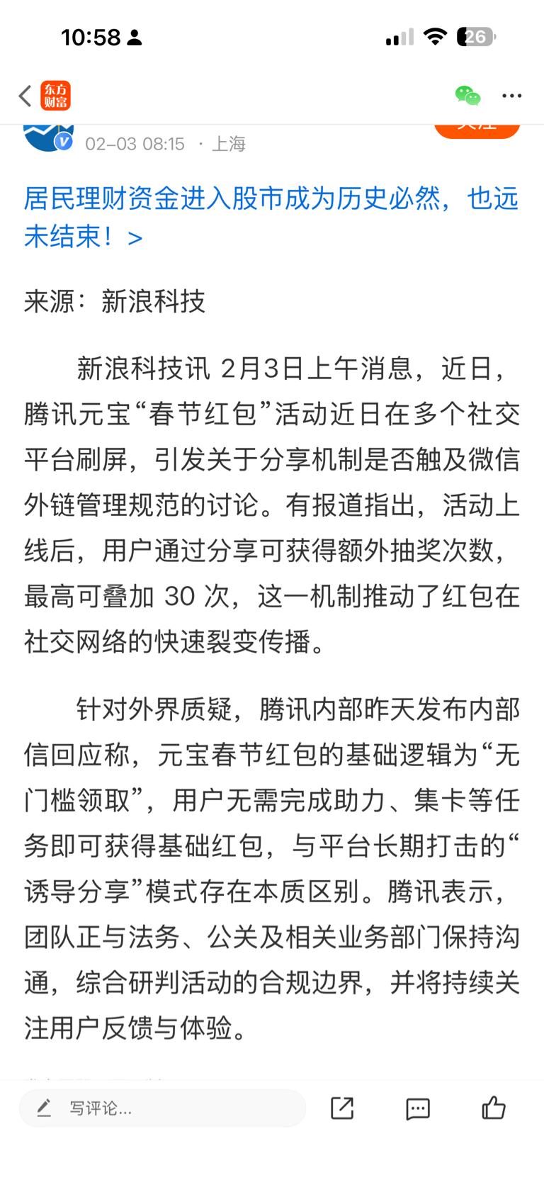 $遥望科技(SZ002291)$ 今天元宝10亿红包暂时禁止微信转发,导致今天Ai应用暴跌,2月6号千文30亿红包开始派送,挺过这两天就好,要挺住啊