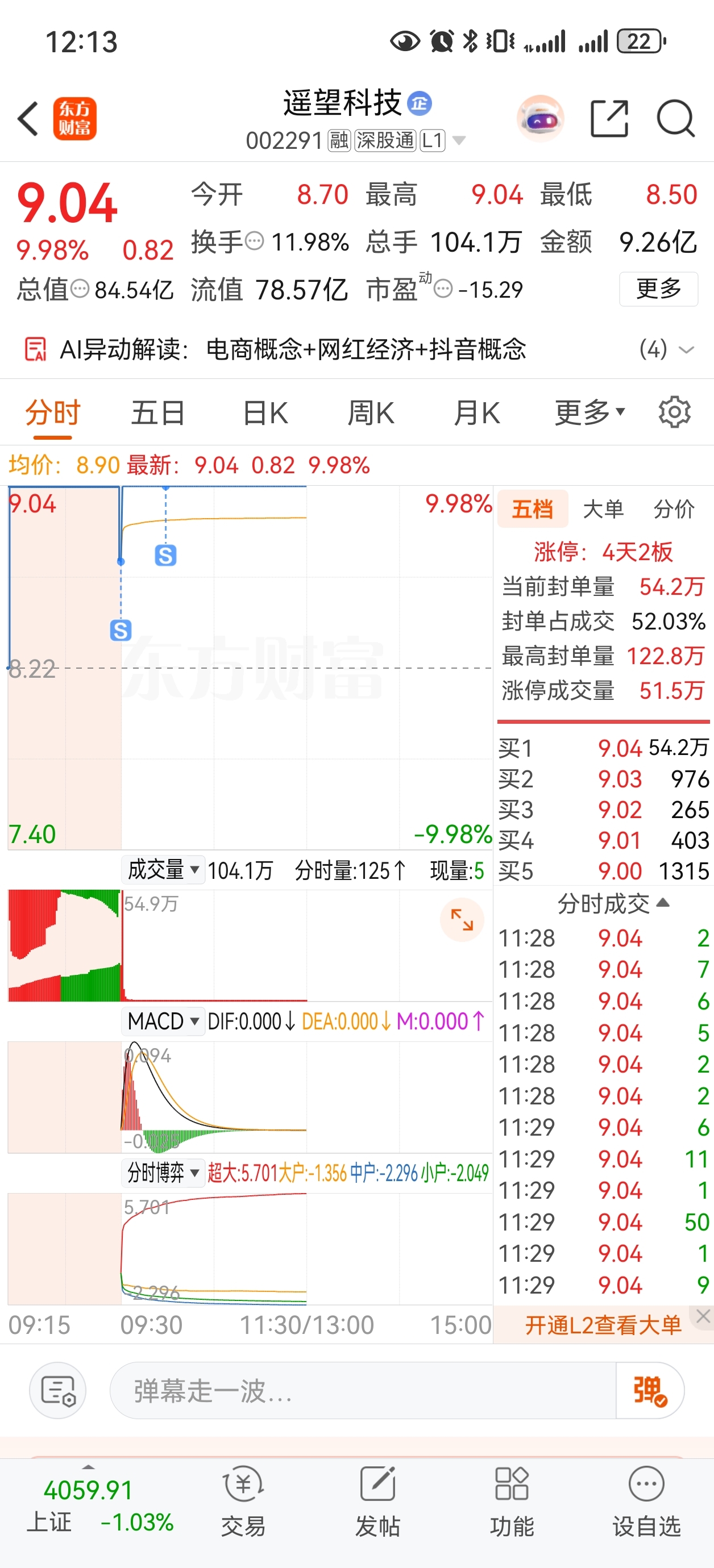 $遥望科技(SZ002291)$ 卖掉了,这么强势感觉会连板,后悔呀