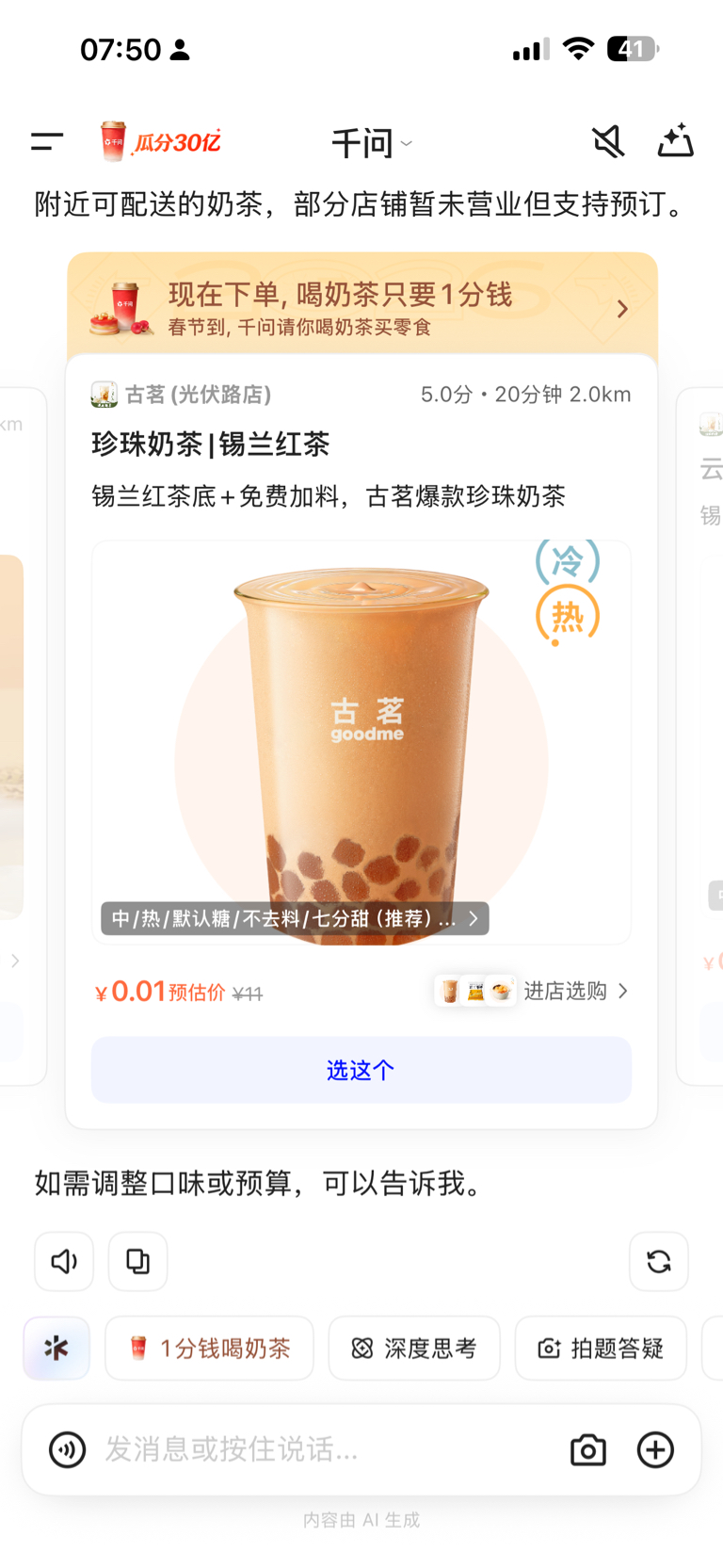 千文30亿红包开始,只要说给我点杯奶茶就可以1分钱喝奶茶,