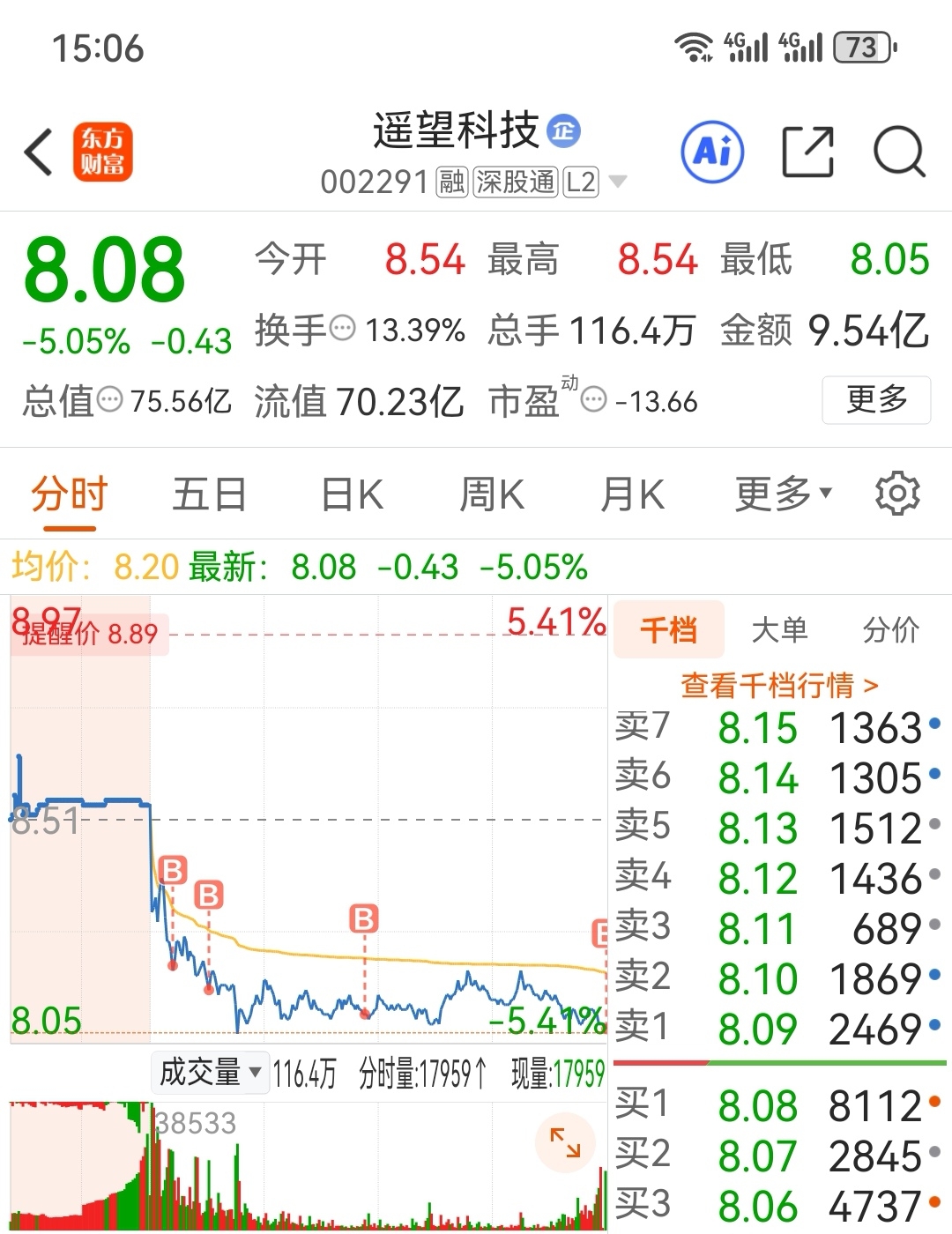 $遥望科技(SZ002291)$ 今天大跌5个点,貌似很恐慌,实则是缩量,是谁在卖?