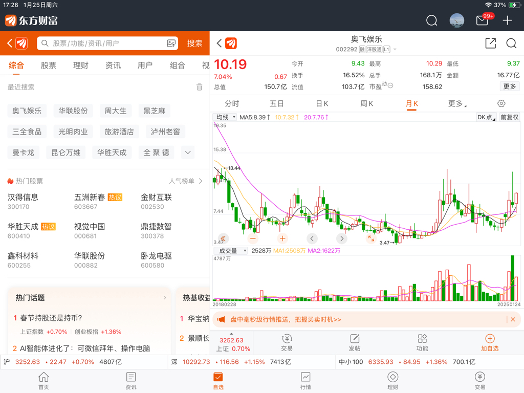 这是一张奥飞娱乐最近几年的月K线图,基本上都是从5块多的地面涨到10块多的山顶.