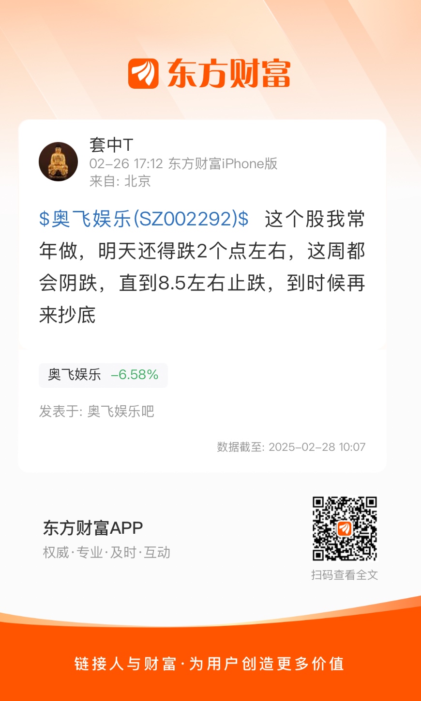 $奥飞娱乐(SZ002292)$  这个股我常年做,明天还得跌2个点左右,这周都会阴跌,直到8.5左右止跌,到时候再来抄底