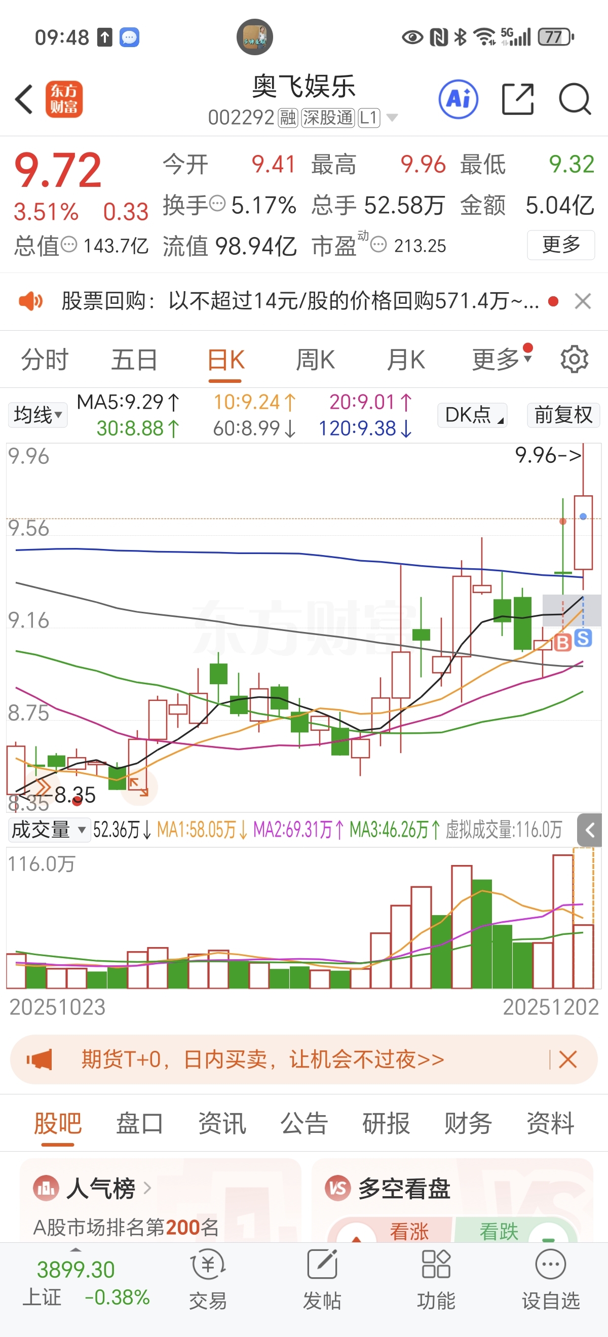 $奥飞娱乐(SZ002292)$ 昨天买的可高了,吓死我了还以为要被套,吧里老哥劝我别担心,果然没套我