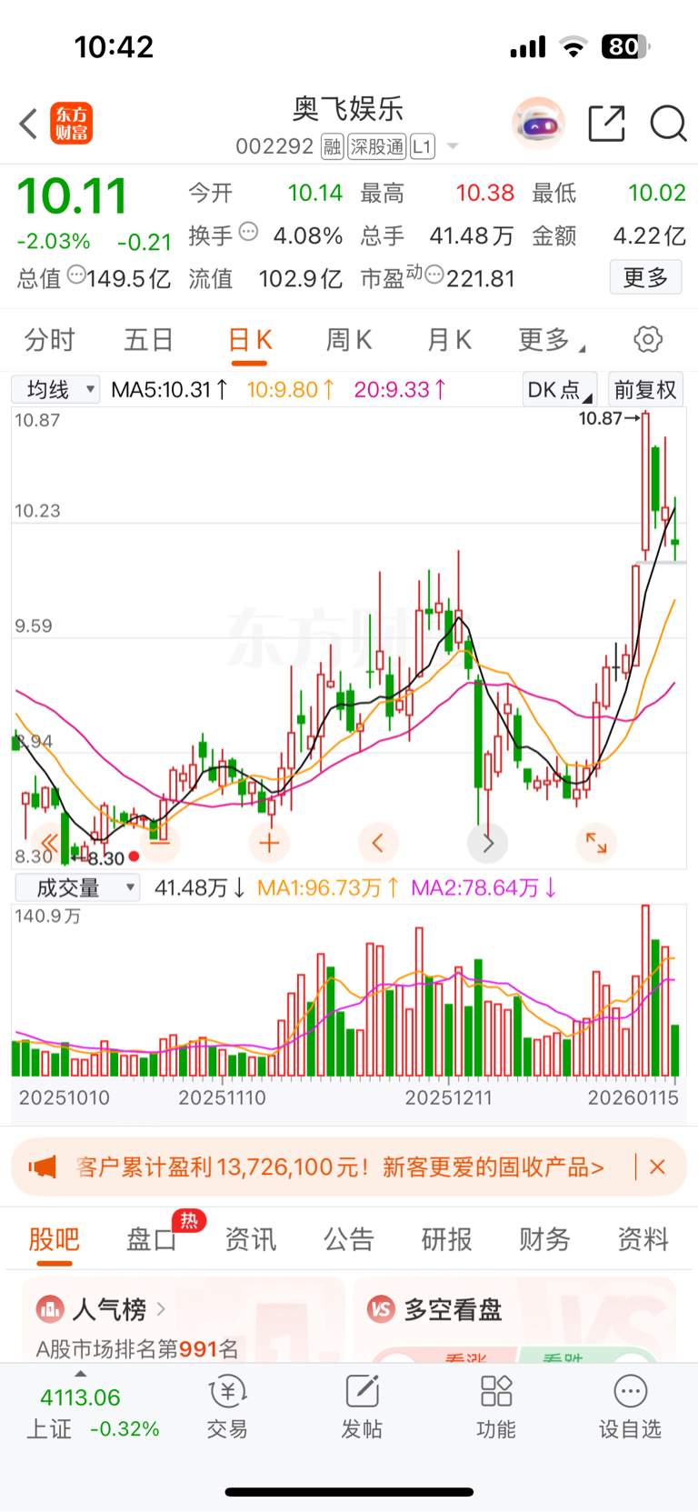 $奥飞娱乐(SZ002292)$ 耐心等待A形刹跌,跌到9元先买入50 W建个底仓,9元之下反反复做T赚差价,只有这样才能赚到钱。耐心等待这周追进的被套牢,不套牢不敢进,不要问为什么?