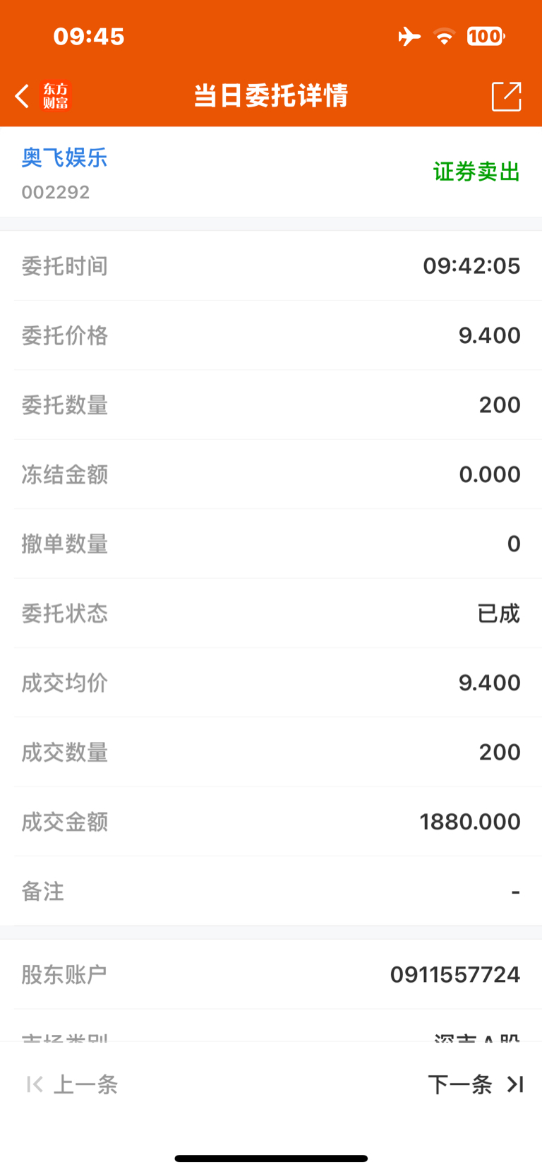 $奥飞娱乐(SZ002292)$ 早上好!朋友们,主动T起来,9.40元先卖出,9.28元以下买回来。奥飞娱乐10元以下无条件做T。看下图,今天的成交单。继续练盘感.找感觉。