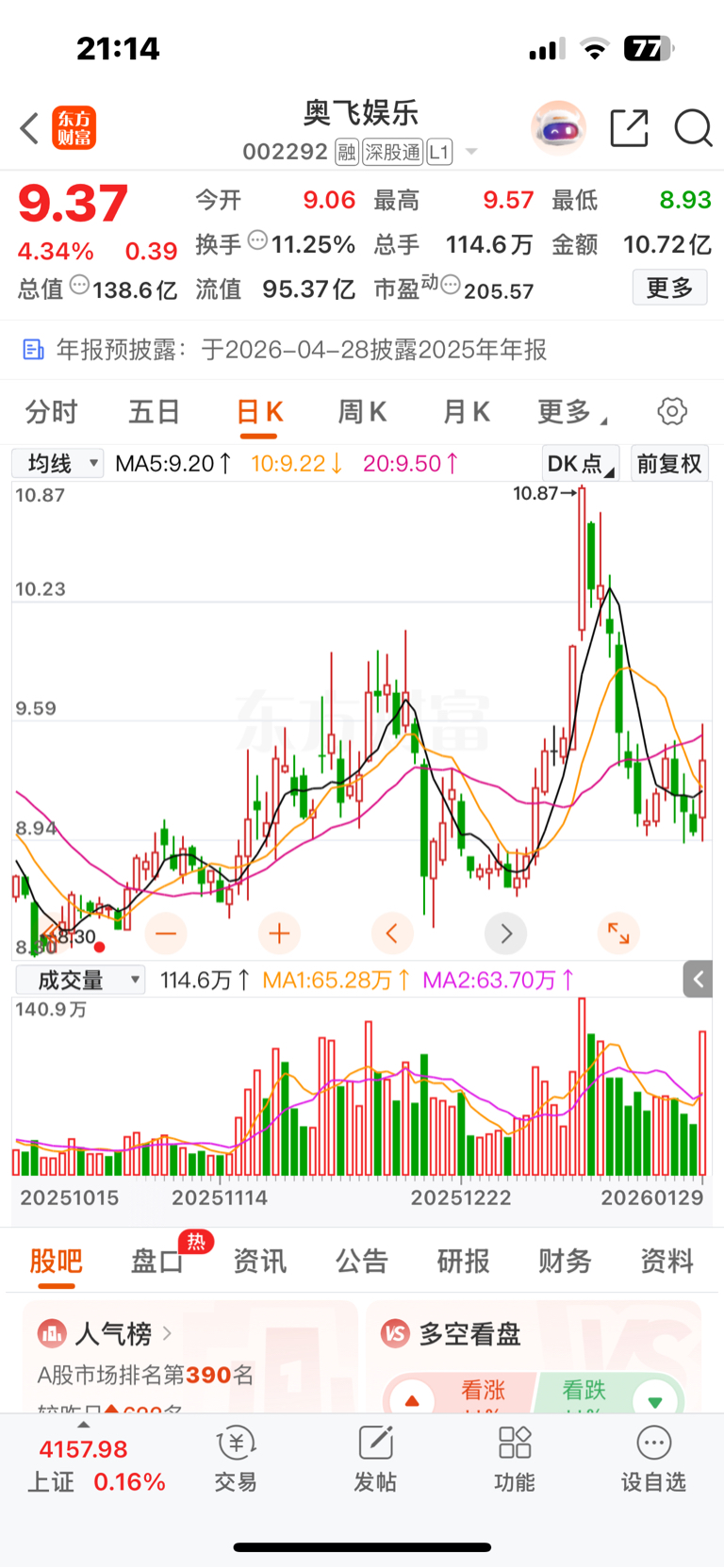 $奥飞娱乐(SZ002292)$ 给个差评,因为不是缩量涨停。本来不想发帖的,但又怕有些朋友看不懂今天这个放量大涨,就简单说几句吧,首先,上升趋势未修复,超跌反弹为主,资金大进大出,看换手率就知道,为何此股长期走不出来,就是因为这票换手率太大,大资金大进大出,这样都已经能搞到钱了,谁又愿意去维护趋势。毕竟,有什么事比做短线赚快钱更舒服?