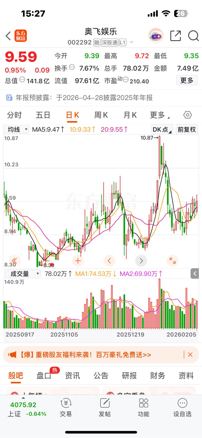 $奥飞娱乐(SZ002292)$ 三天有两天站稳20日均线,大盘三天有两天都在暴跌,但是奥飞娱乐已经免疫不跟大盘,易涨难跌,股性真的转强了,这都是熬出来的精华,留下的股友都是铁铁的,不铁的那些已被清理出局。按原计划,小碎步站稳10元,继续锁仓,持股过春节!