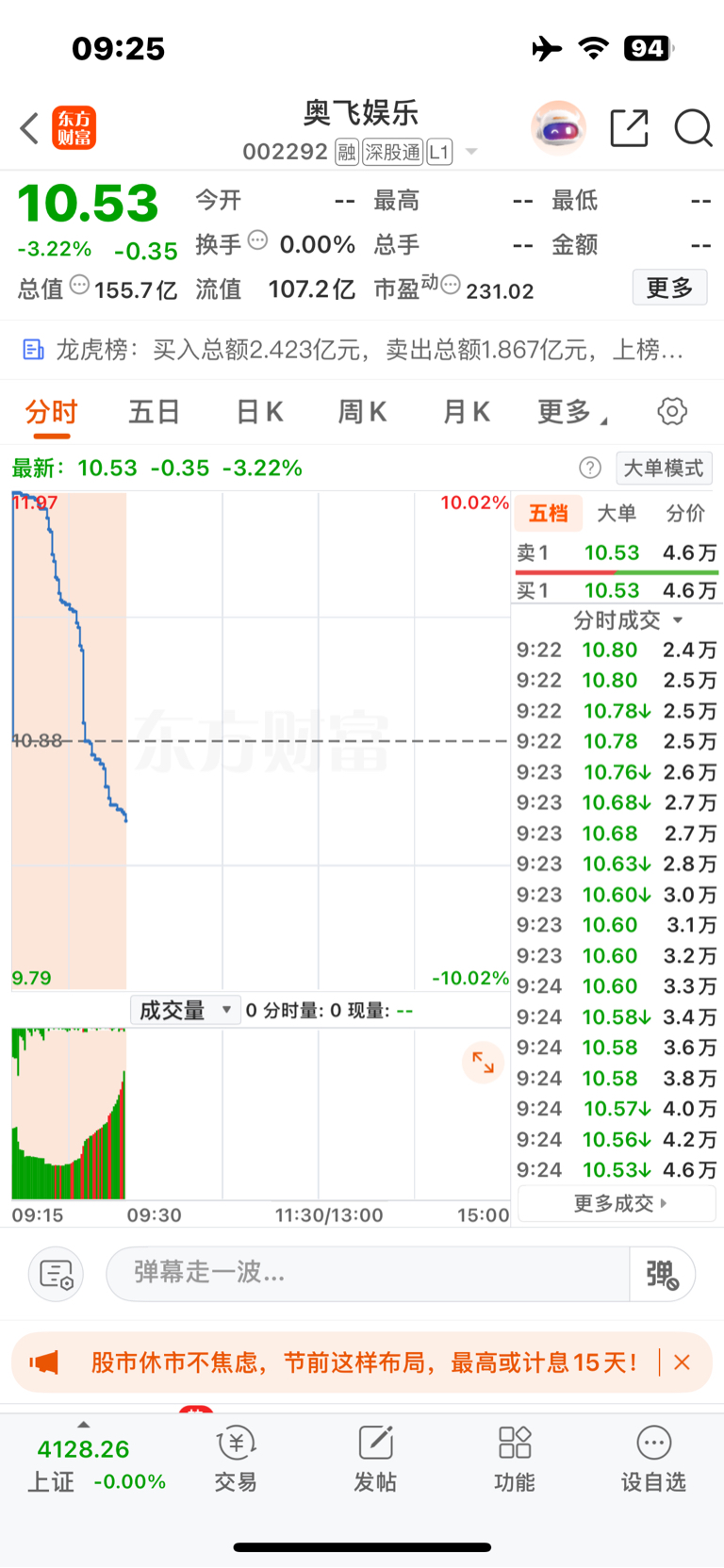 今天特别注意!奥飞娱乐如果早盘竞价10.69元的6.7万手到收盘是否被关小黑屋,