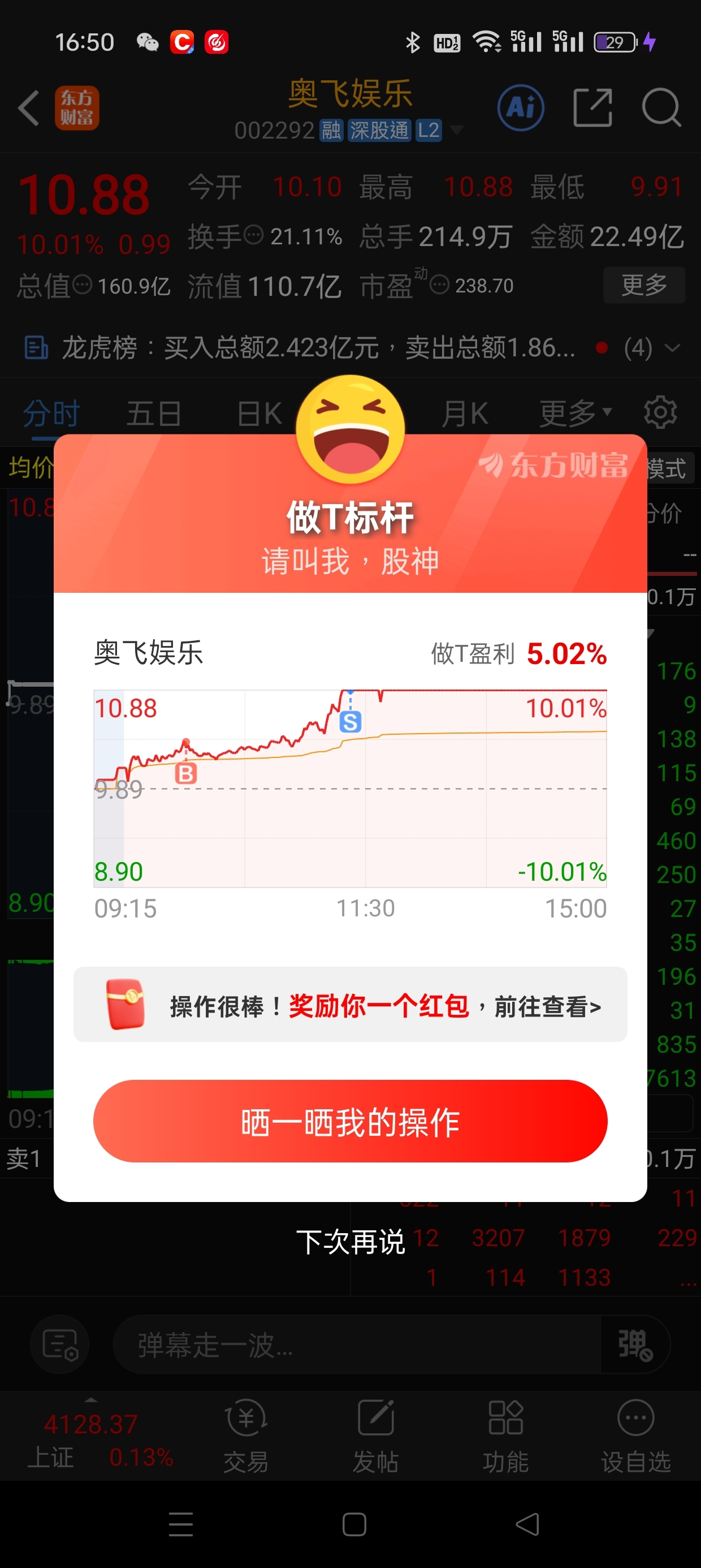 $奥飞娱乐(SZ002292)$ 我昨天只留底仓,给大家一个建议,昨天顶部追的5日线做T,有利润的朋友可以先行离场,半个小时量能已经达到昨天60%符合主力出货,我想很多朋友想博弈春节预期,但我建议先出货等启动再说