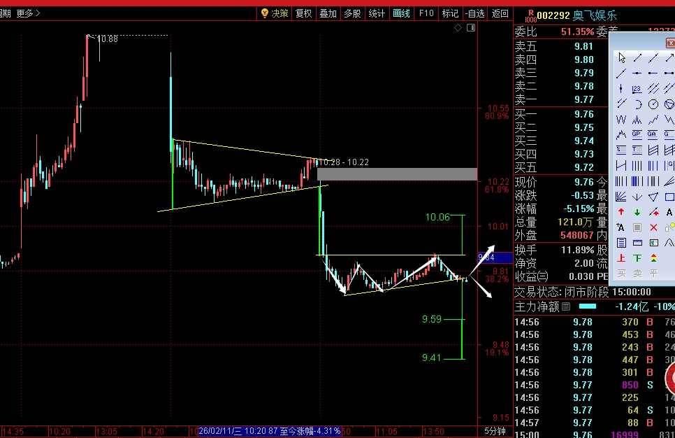 $奥飞娱乐(SZ002292)$ 5分钟跌破颈线继续寻底?跌一波9.6跌2波9.4跌3波9.23应该不会再低了,如果向上突破9.88平台到10.06?日线形态破坏又进入漫无边际的旅程