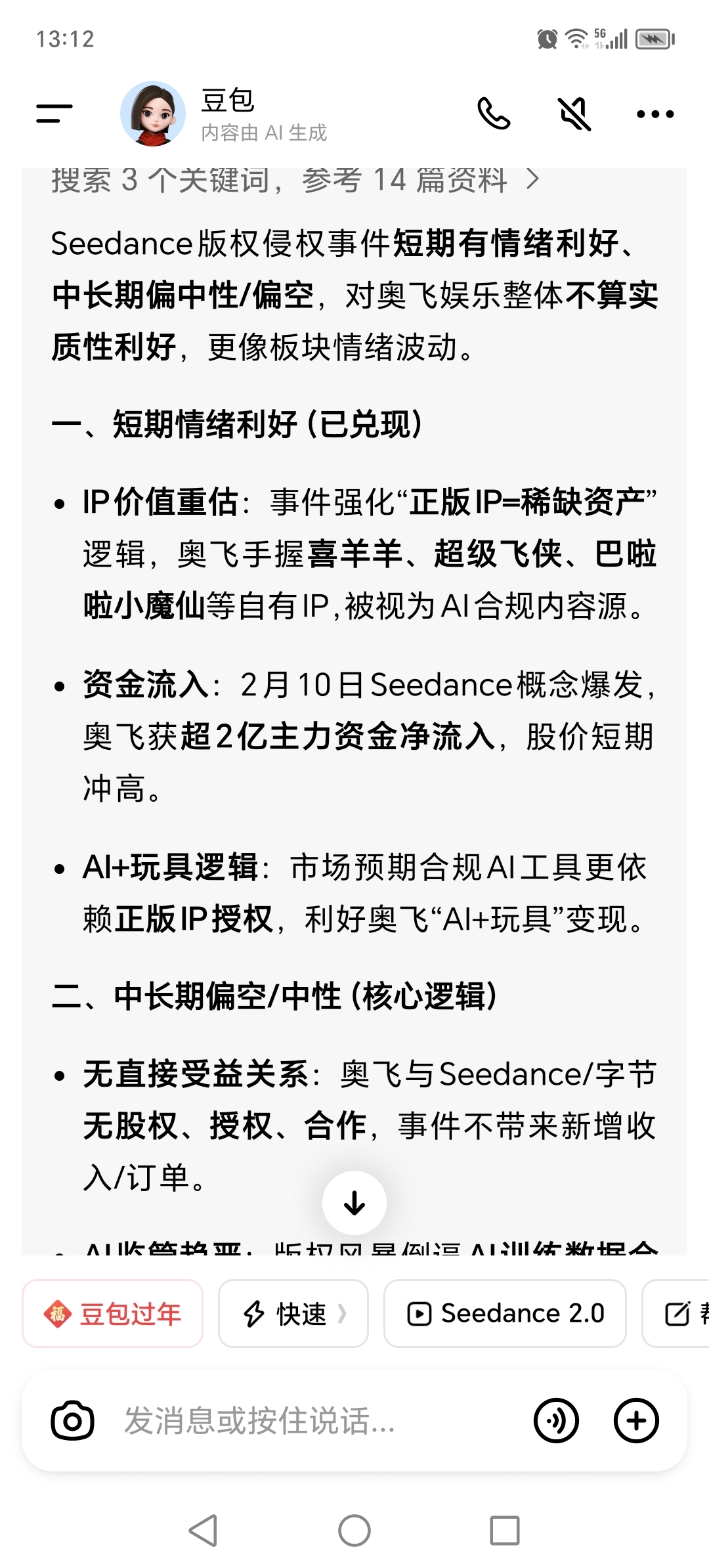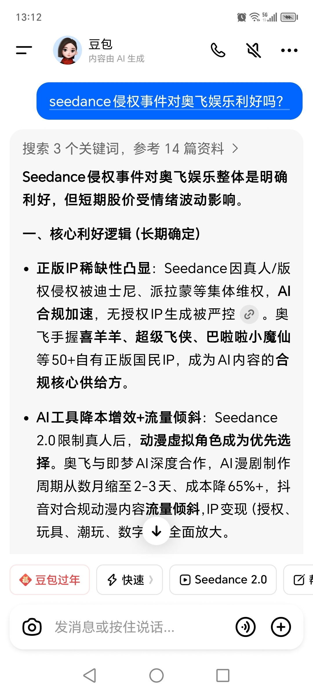 seedance版权侵权事件在慢慢发酵,这是我13日问的,不认为该事件对奥飞利好。