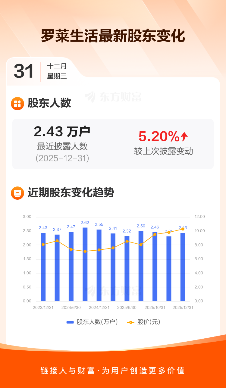 罗莱生活最新披露数据显示,截至12月31日公司股东户数为2.43万户,较上期(2025年12月10日)增加1200户,增幅为5.20%。户均持有流通股数量由上期的3.58万股下降至3.40万股,户均持股金额由上期的35.07万元减少至34.94万元。