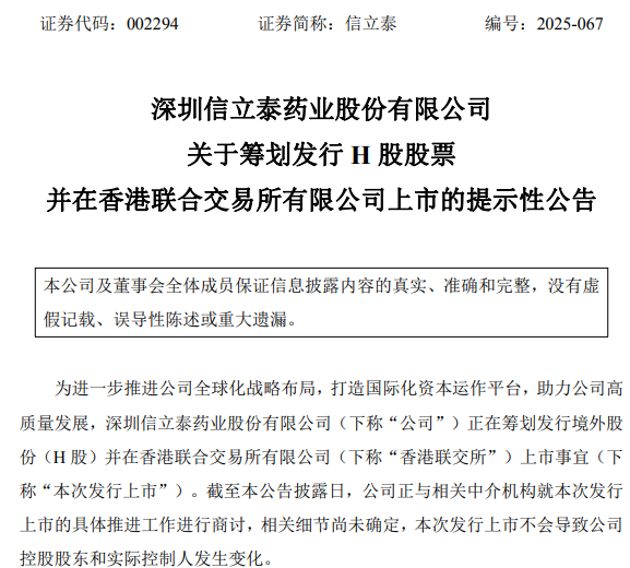 12月11日,信立泰(002294)发布公告,公司正在筹划发行境外股份(H股)并在香港联合交易所上市,以推进公司全球化战略布局和打造国际化资本运作平台,助力公司高质量发展。