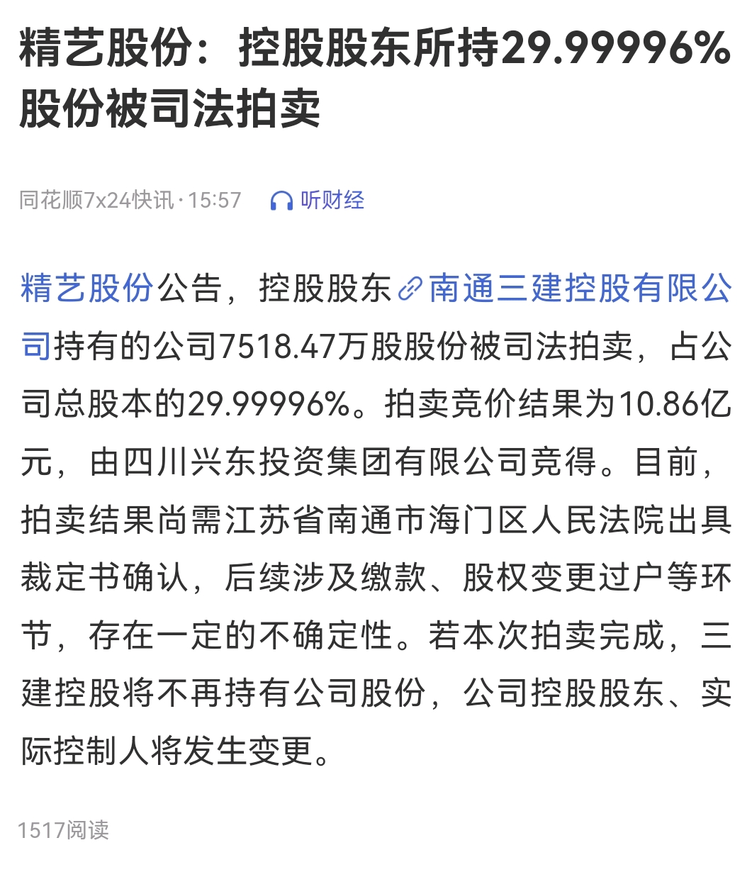 以每股14.44的价格拿下精艺股份控制权,按规则控股股东变更是要停盘的,今天的砸