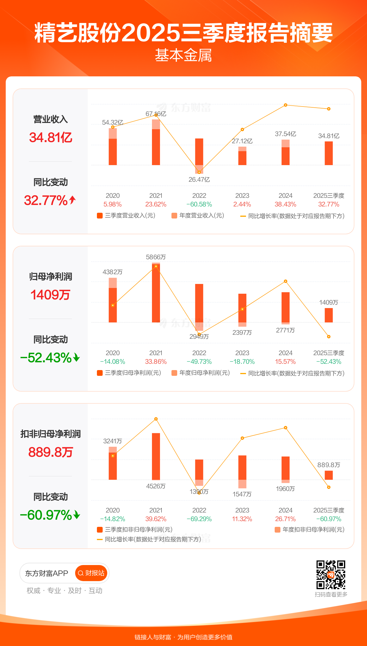 精艺股份10月29日发布2025年三季报显示,公司前三季实现营业收入34.81亿元,同比增长32.77%;归母净利润1409.16万元,同比下滑52.43%;扣非归母净利润889.83万元,同比下滑60.97%。