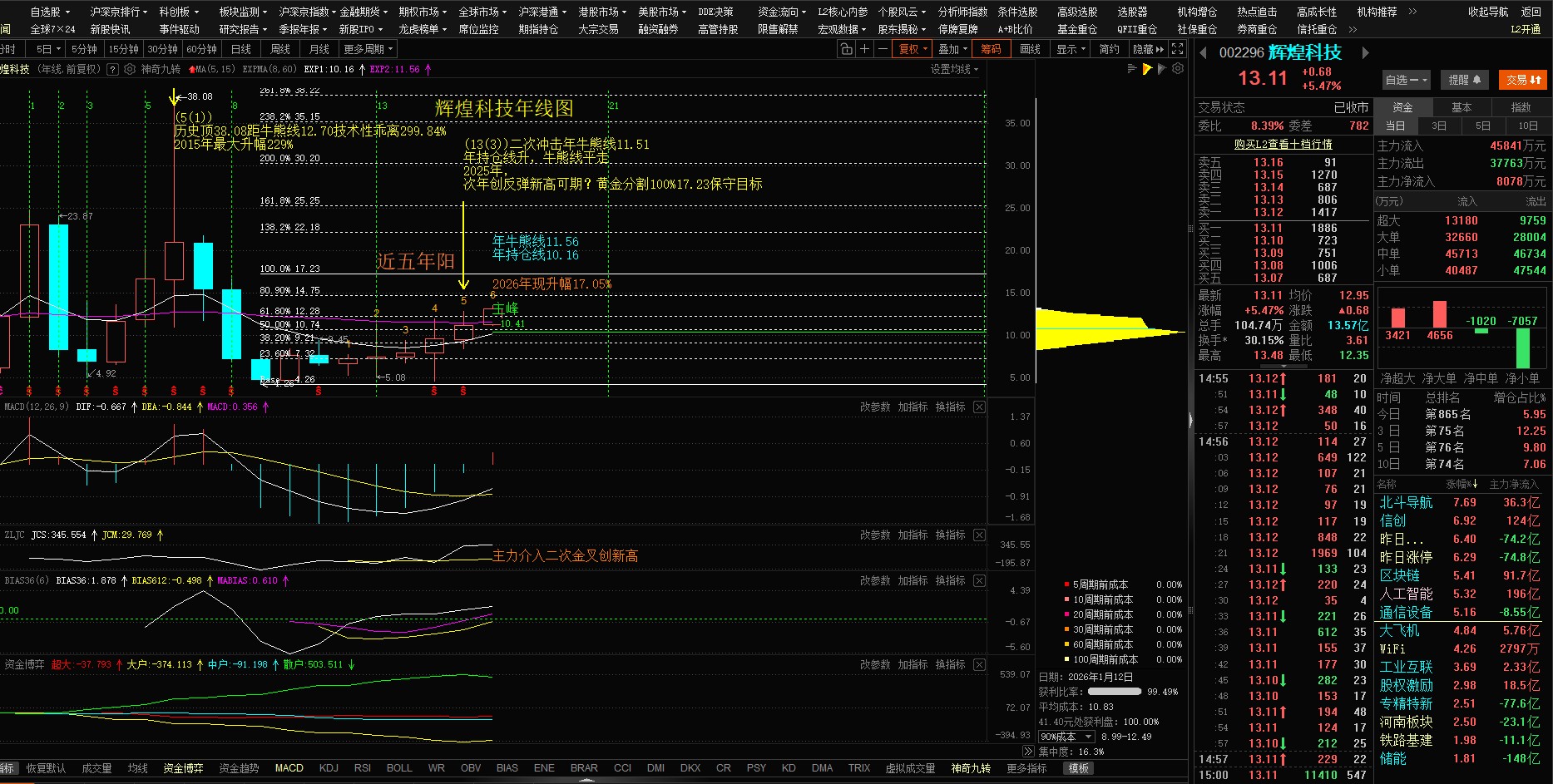回到辉煌科技,今年升幅17.05%,年线五连阳,走出8年筑底突破颈线11.61有效,从技术形态看2026~2027年有可能横有多长,升有多高,这就必须大盘能守住3300以上,主力完成吸筹才能上升到黄金分割位100%17.23以上,是算比较保守的后市预判!