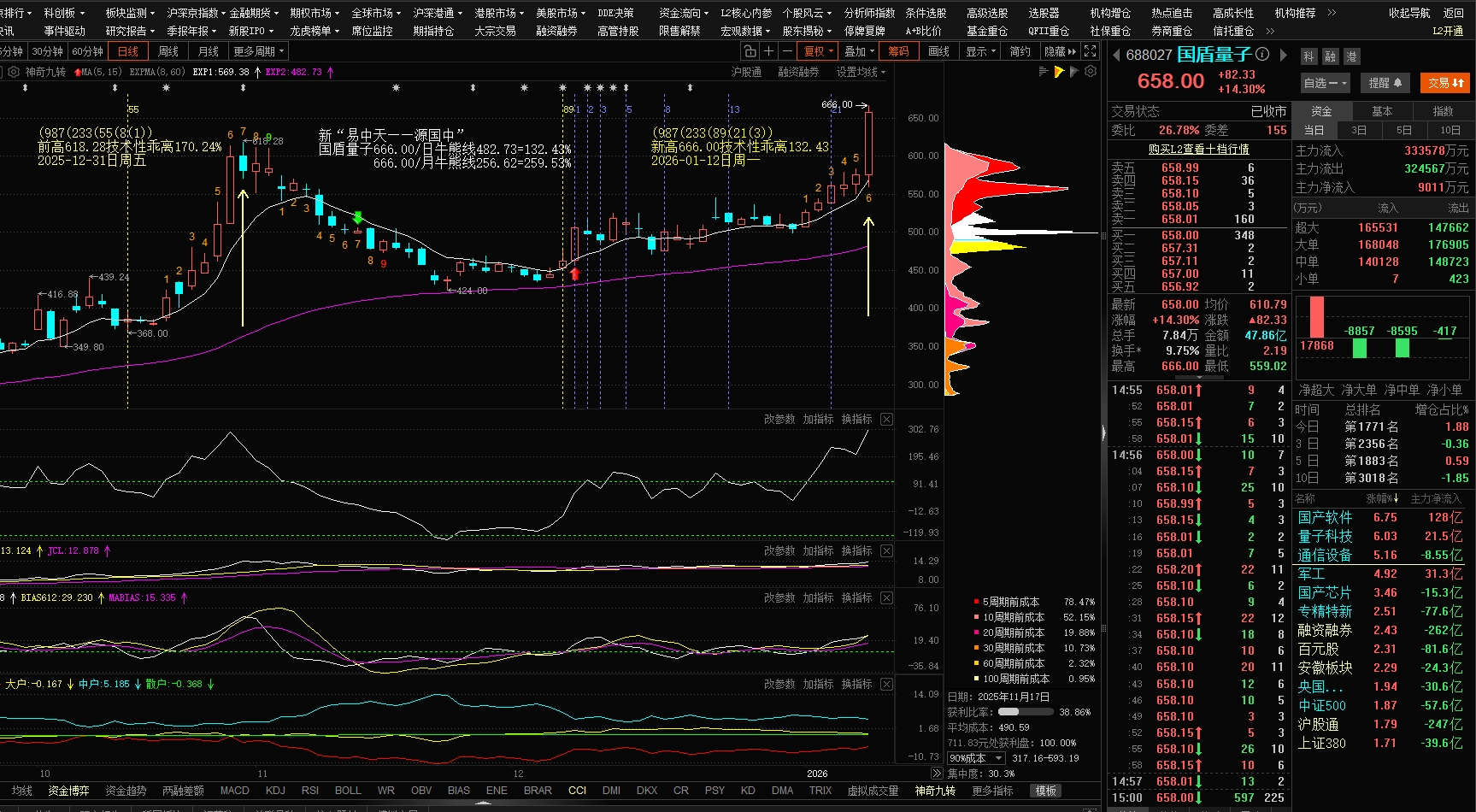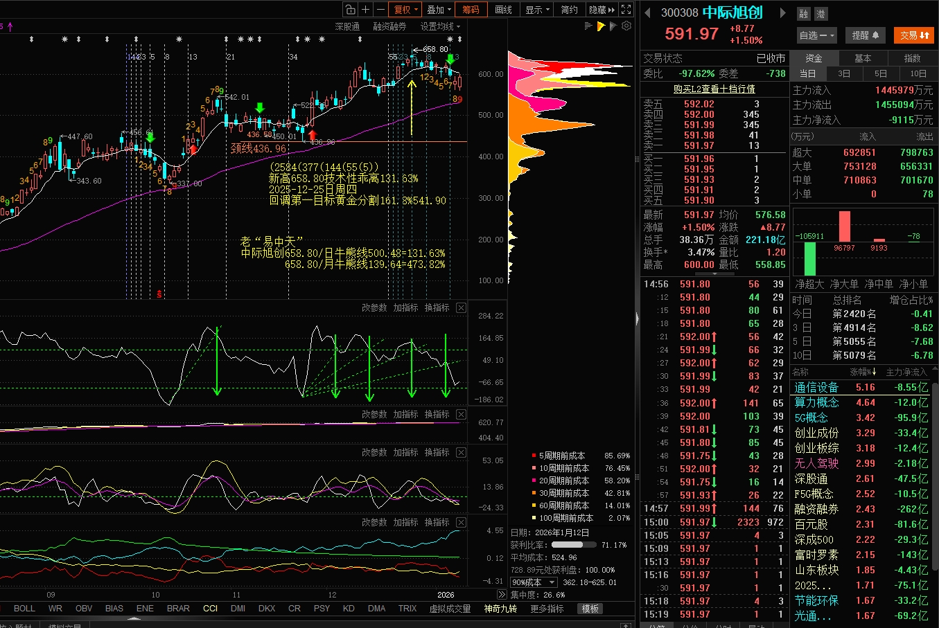 这从CPO概念的老“易中天”去年12月筑顶进入日级下跌九转段,市场游资主力启动新“易中天——源国中”中小盘CPO接力,就是源杰科技、国盾量子、中微公司;近日创新高: