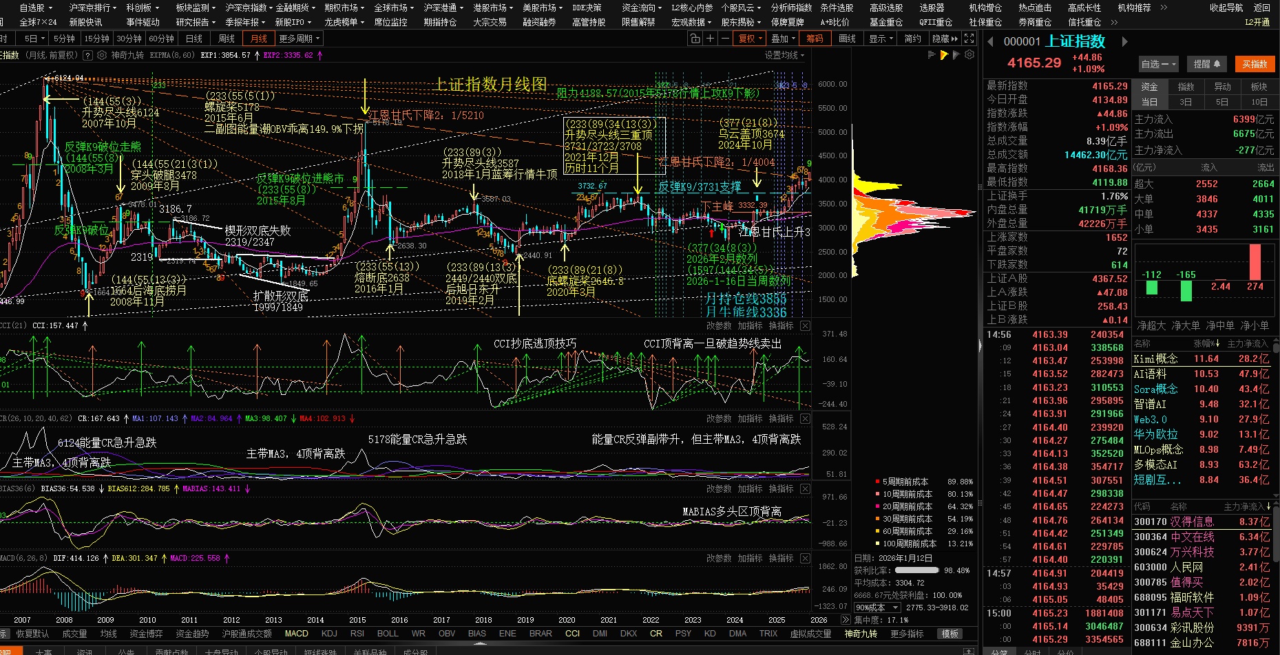 大盘2月(377(34(8(3))处变盘敏感月,本周(1587(144(34(5))处变盘敏感周,也是期指交割周,关注天量成交,昨市场主力净流出-347.3亿/36014.5成交额0.96%。