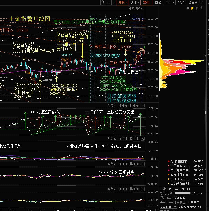 在所有技术指标和筹码峰分布!上图是昨天截止的月线图,筹码峰堆积在3350~3150,历时22个月;
