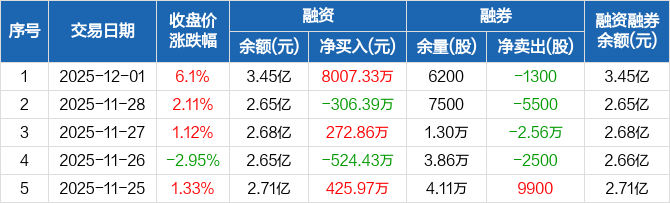 融资方面,当日融资买入1.38亿元,融资偿还5825.52万元,融资净买入8007.33万元,净买入额创历史新高。融券方面,融券卖出5800股,融券偿还7100股,融券余量6200股,融券余额6.04万元。融资融券余额合计3.45亿元。