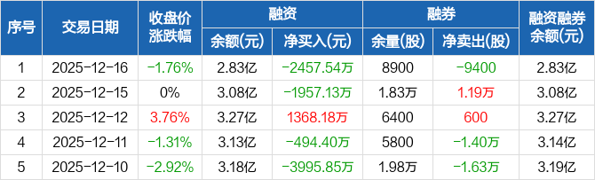融资方面,当日融资买入1970.22万元,融资偿还4427.76万元,融资净偿还2457.54万元。融券方面,融券卖出600股,融券偿还1万股,融券余量8900股,融券余额8.92万元。融资融券余额合计2.83亿元。