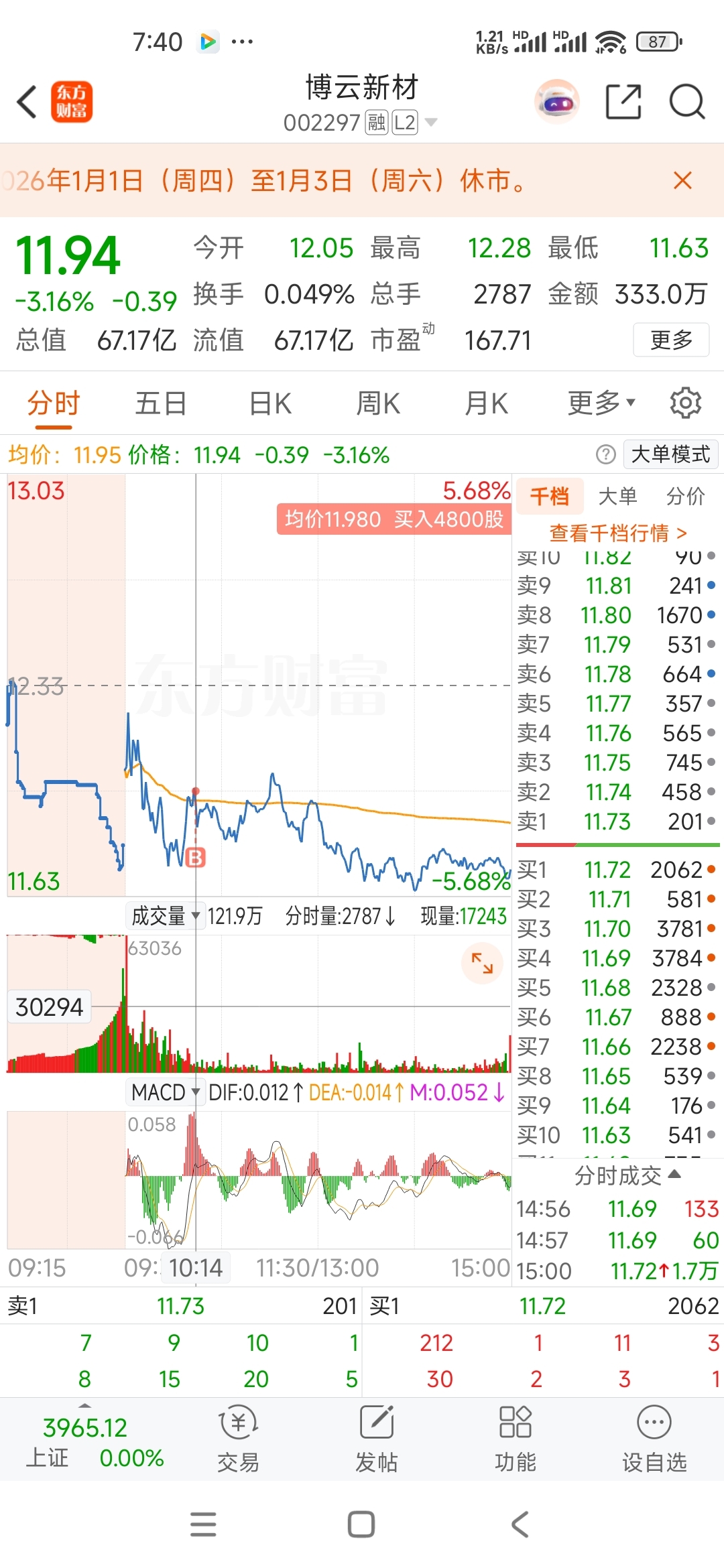 $博云新材(SZ002297)$ 昨天12.92卖的,今天冲动又买进了,早上看它第二次向上突破均线才买的,明天希望能给个机会跑?