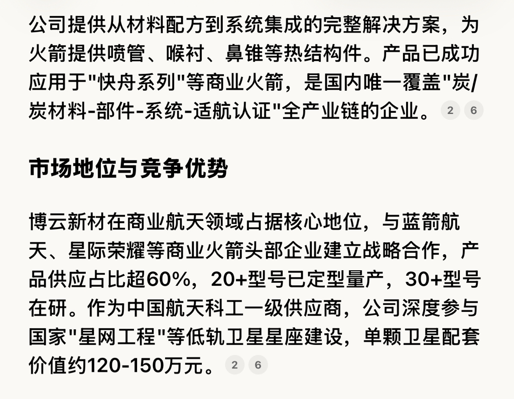 自主研发的碳 / 碳复合材料耐 1450℃+ 高温和强烧蚀,性能超国际标准 15%,是火箭发动机 "咽喉" 级关键部件,获 46 项发明专利保护,技术壁垒需 5-8 年才能突破。