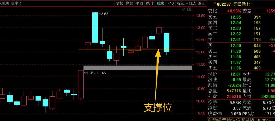 $博云新材(SZ002297)$ 中期趋势不错,不过短线连续拉高后,最近两周都是高位的震荡盘整中,今天大幅回落,把前面小阳线逐步拉高的涨幅覆盖了,不是很好看,短线接下来重点盯着横线位置的得失,能稳住就还行,能继续看震荡盘整,但有效跌破就要注意短线的继续回落风险了,需要控制仓位应对。#炒股日记# #强势机会#