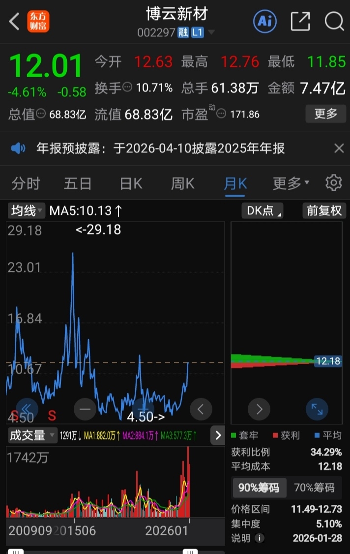 $博云新材(SZ002297)$ 历史大双底形成,突破可翻倍到18。题材航天,军工,无人机,小金属。业绩由负变正翻10倍,