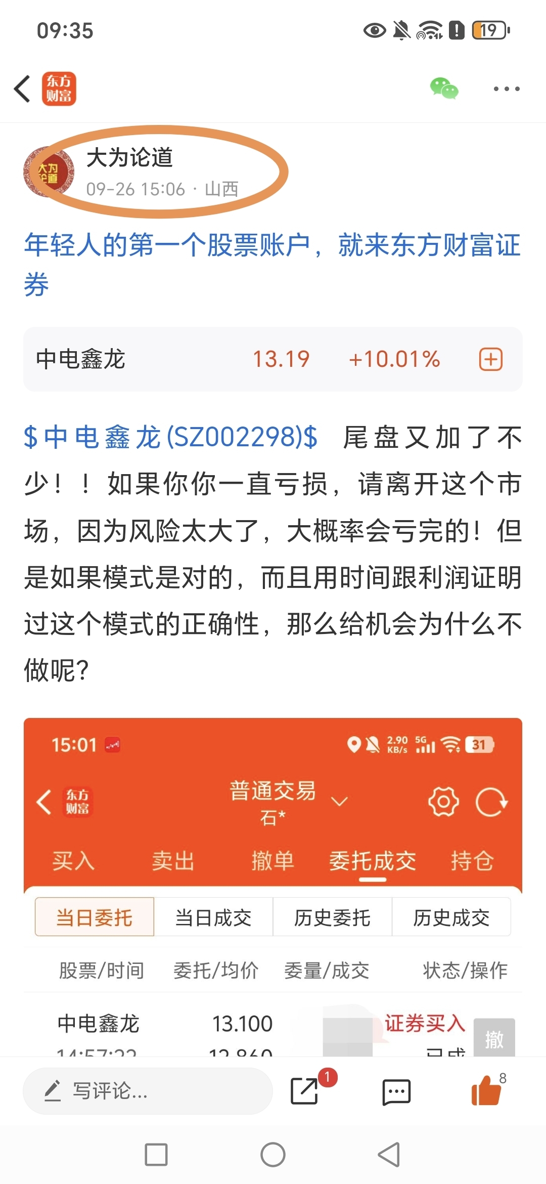 $中电鑫龙(SZ002298)$ 虽迟但到,说实话昨天大盘大涨但是这个大跌,压力还是很大的!好在忍住了!如果你的模式是对的,那么就要坚持下去,晚一天也会涨回来的!