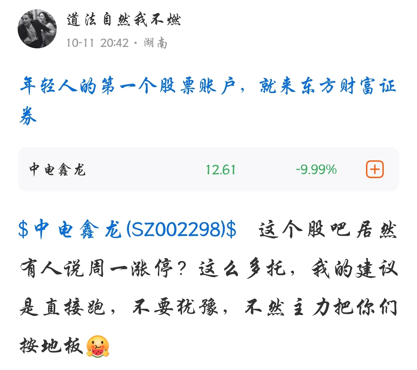 $中电鑫龙(SZ002298)$ 周末就说了,这么多唱多的,肯定按地板,还有人怼我,现在都老实了吧