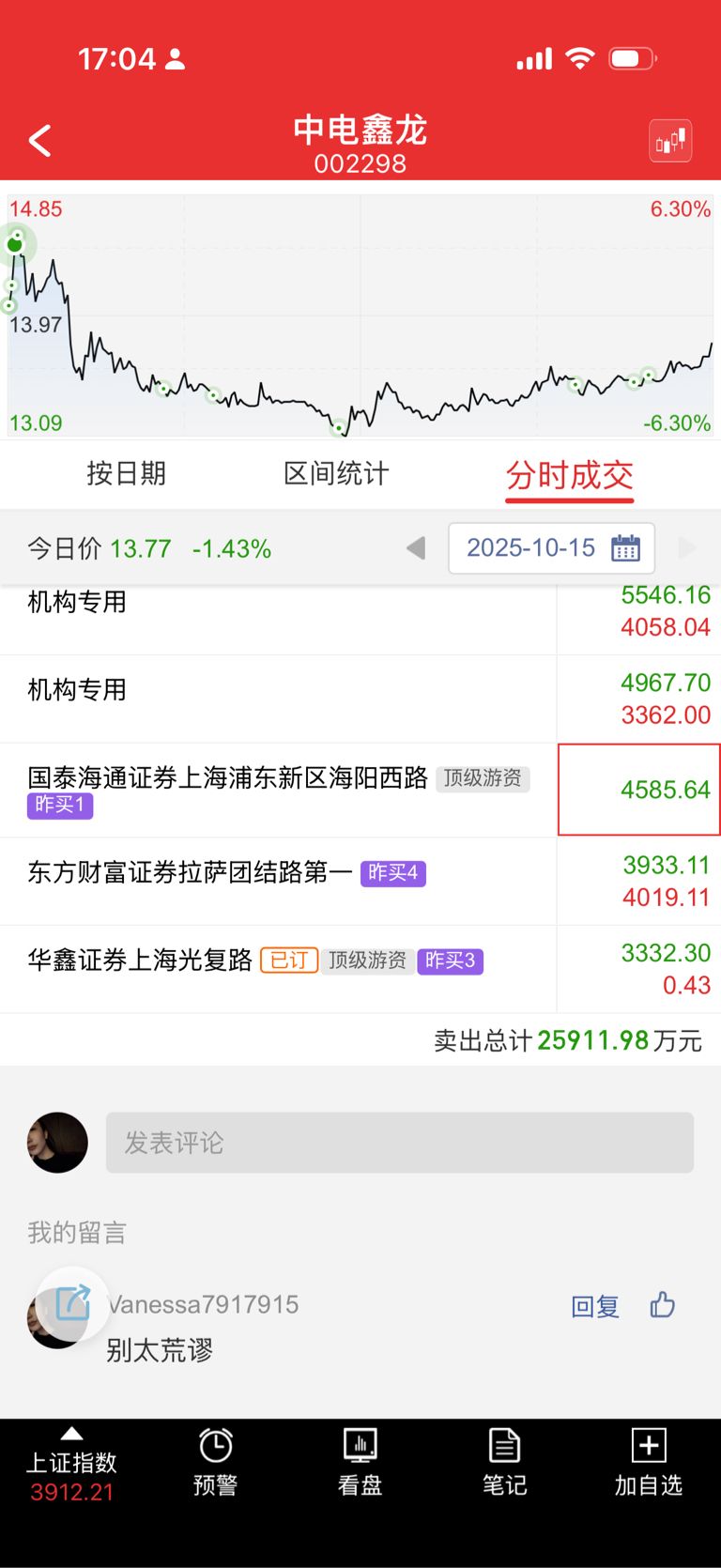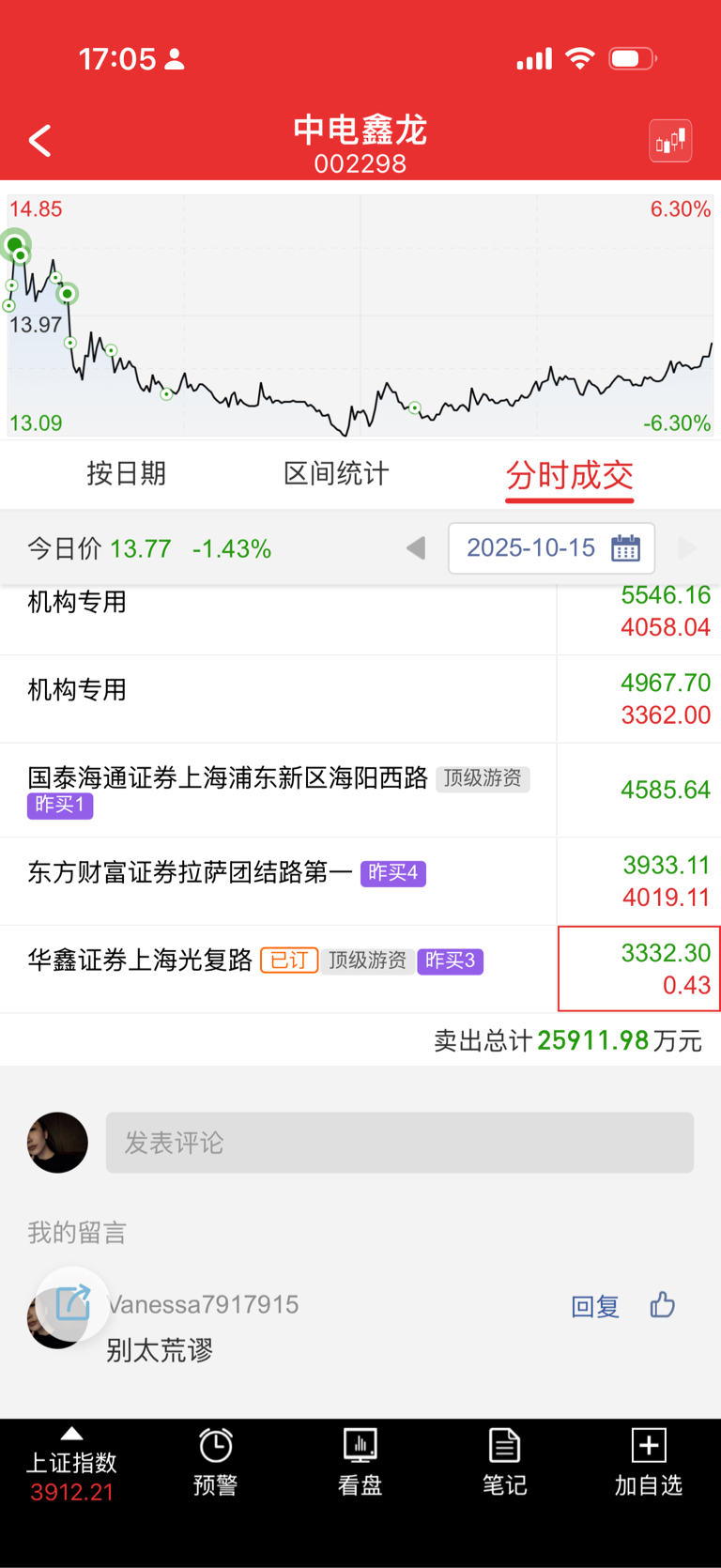 $中电鑫龙(SZ002298)$ 典型柚子砸盘拿筹码,和我早上预判的一样。早盘两个冲高的卖点没问题,后面就搞笑了...砸一波,有一个低点可以小单吸真的别太荒谬了,普通人都不会这么卖,钱多吗?龙虎榜要看细节,看盘也要看细节