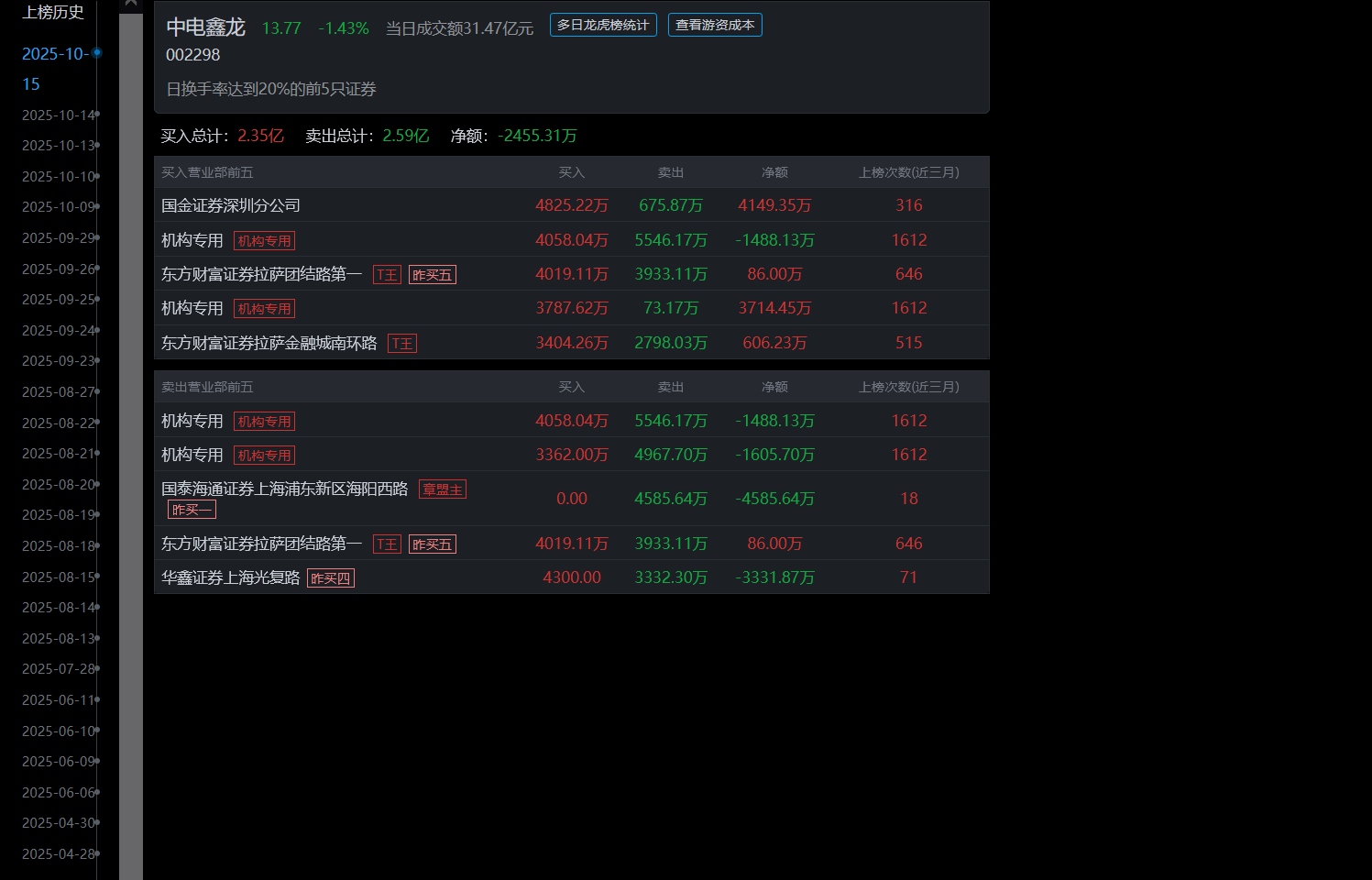 中电鑫龙今日游资龙虎榜席位上榜数据如下!
