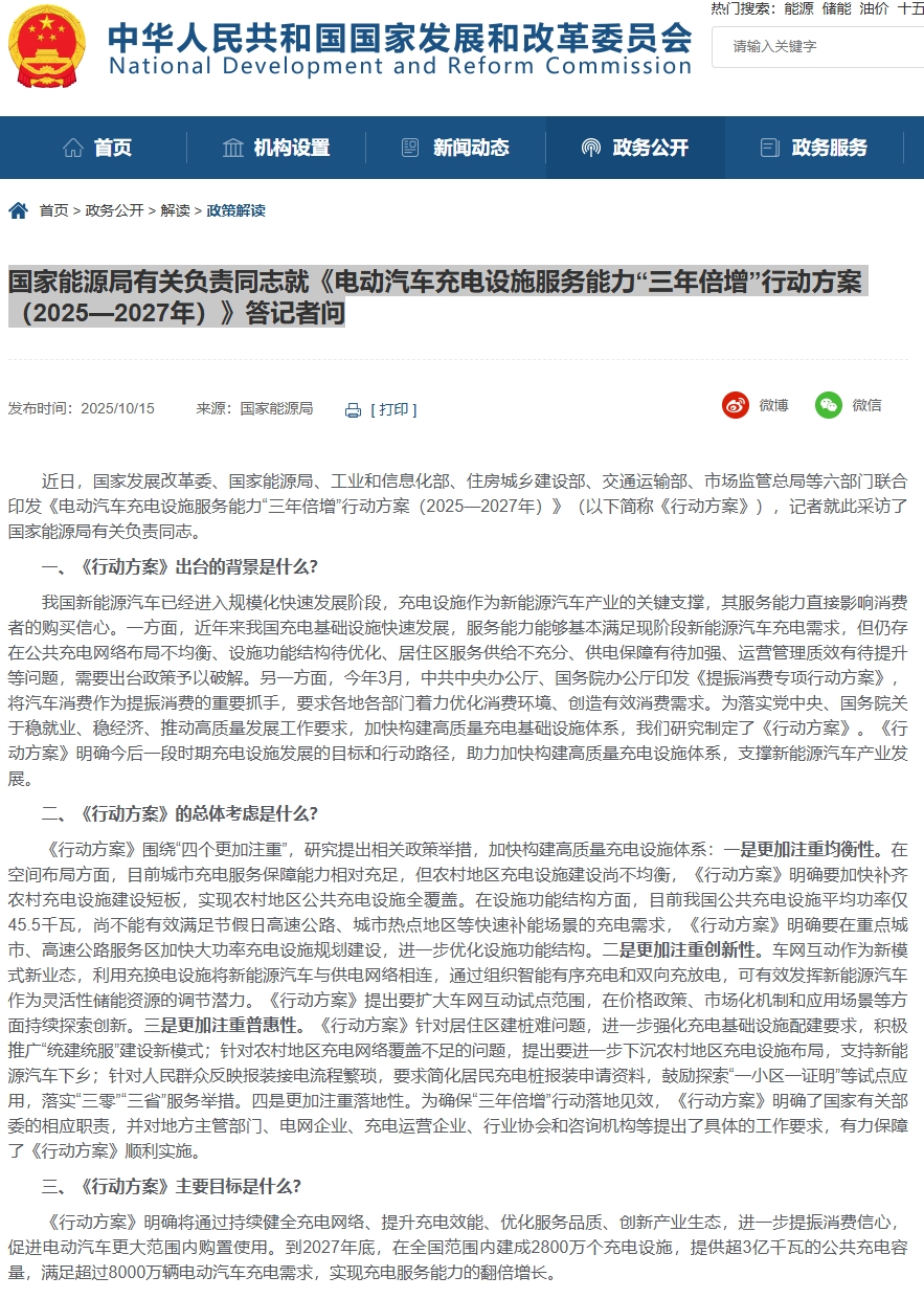国家能源局有关负责同志就《电动汽车充电设施服务能力“三年倍增”行动方案(2025—2027年)》答记者问
