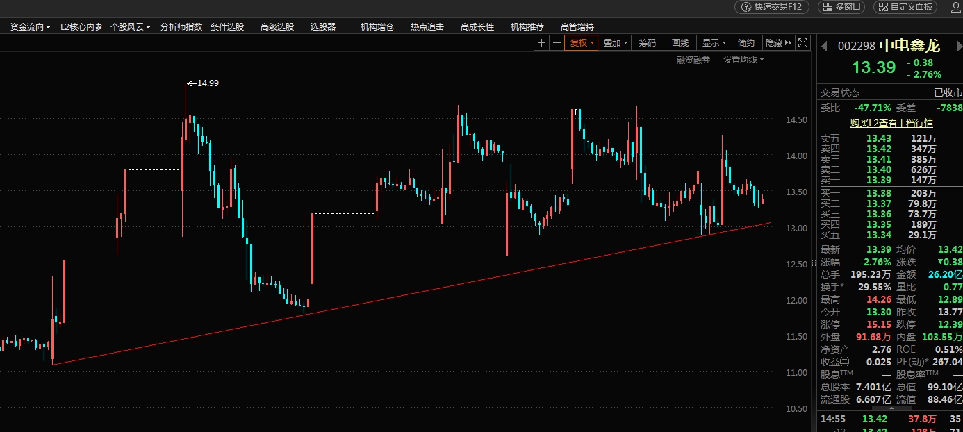 $中电鑫龙(SZ002298)$ 再发一个图,给看多不做t的兄弟们一点点信心,力的成本变化,12.84,13.24,13.34,没细算,这几天操盘印象中的底价,上下差几分钱,底部不断抬高,后续怎么走就清晰了,做t也不是瞎做的