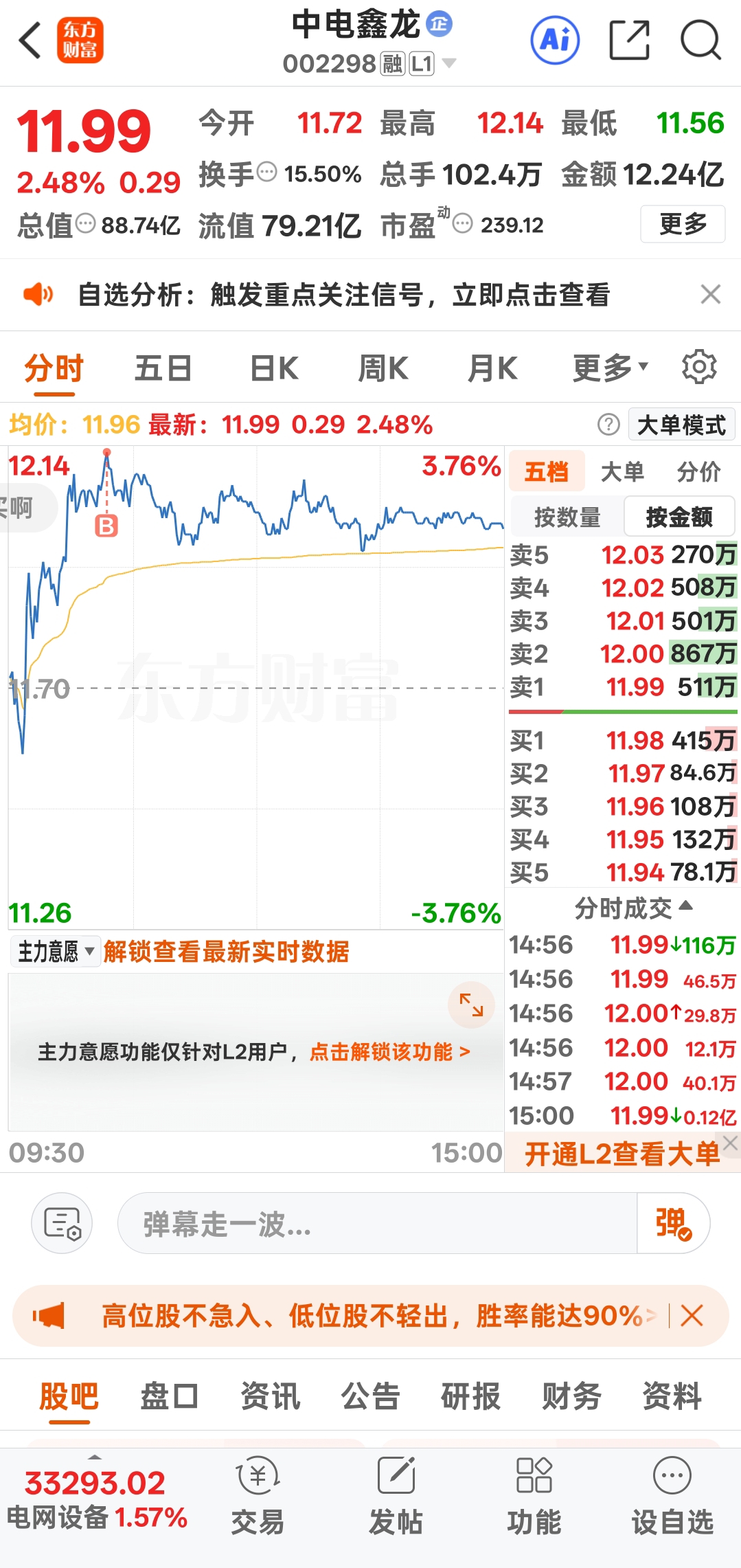 $中电鑫龙(SZ002298)$ 本以为可以到12.8以上的,指数也没有带起来,有承接是弱承接,明天若强势还有向上冲击12.35/12.5,强势冲击12.6/12.8的可能