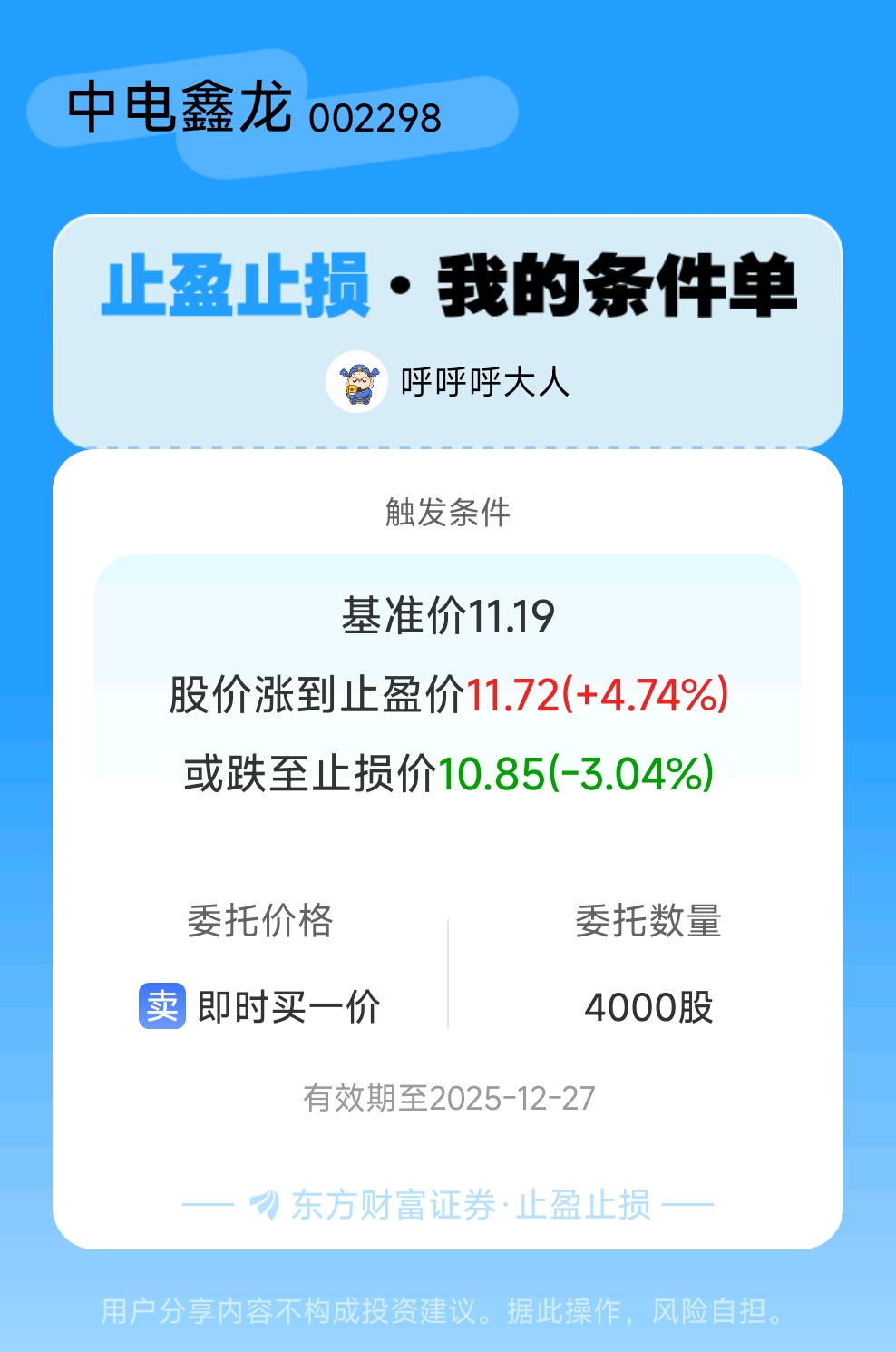 #条件单交流# #止盈止损晒单# 一位股神设置了一个止盈止损条件单,接下来就是见证奇迹的时刻~$中电鑫龙(SZ002298)$