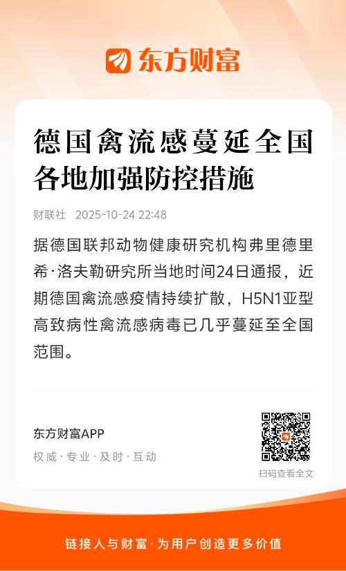 据德国联邦动物健康研究机构弗里德里希·洛夫勒研究所当地时间24日通报,近期德国禽流感疫情持续扩散,H5N1亚型高致病性禽流感病毒已几乎蔓延至全国范围。除不来梅外,德国各联邦州均在死亡野生鸟类中检测出相关病毒感染。按照该研究所发言人的说法,目前“禽流感疫情呈现出动态活跃态势,波及对象已从鹤类扩展至多种鸟类”。机构指出,随着秋季候鸟迁徙进入高峰期,病毒在野生鸟类间的传播风险进一步增加,家禽养殖场也面临更高的传入风险。