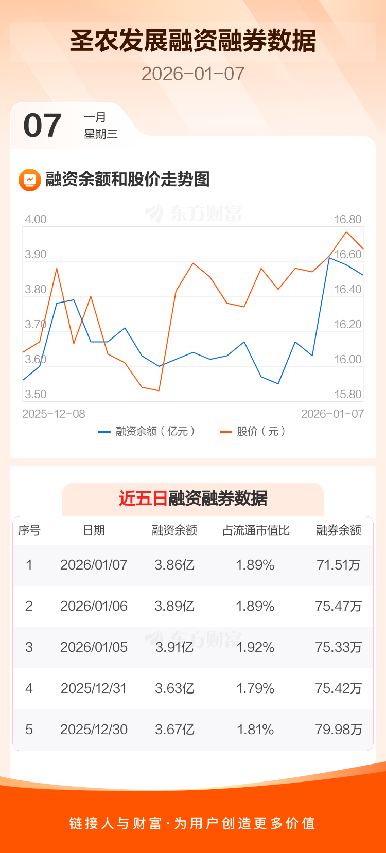 交易所最新数据显示,圣农发展于2026年1月7日获融资买入1649.27万元,融资偿还1889.57万元,当日融资净偿还240.3万元。目前,该股融资余额3.86亿,占流通市值比例为1.89%。
