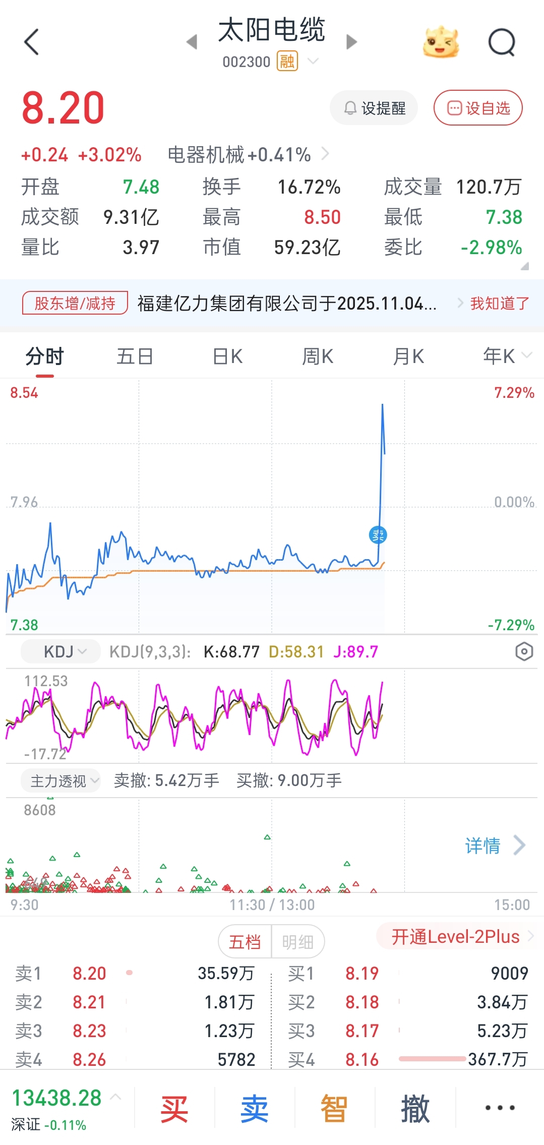 $太阳电缆(SZ002300)$ 我一卖,1秒后就涨起来了,
