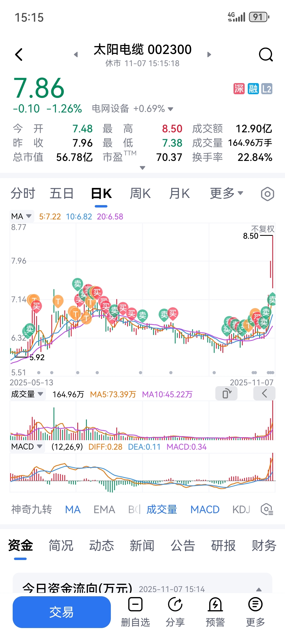 $太阳电缆(SZ002300)$ 拿了半年,知足了